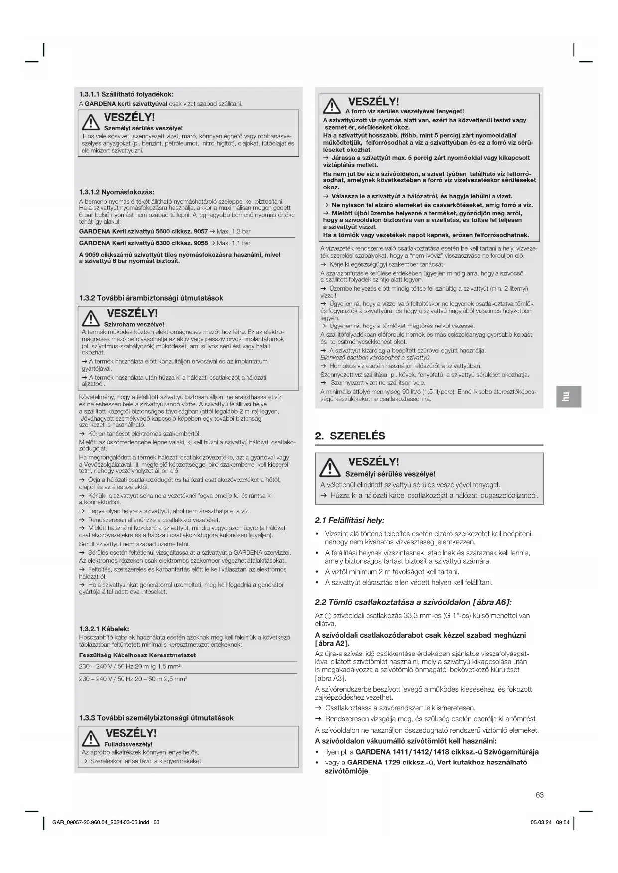 VESZÉLY! Szívroham veszélye!A termék működés közben elektromágneses mezőt hoz létre. Ez az elektro-mágneses mező befolyásolhatja az aktív vagy passzív orvosi implantátumok (pl. szívritmus-szabályozók) működését, ami súlyos sérülést vagy halált okozhat.v A termék használata előtt konzultáljon orvosával és az implantátum gyártó jával. v A termék használata után húzza ki a hálózati csatlakozót a hálózati aljzatból.Követelmény, hogy a felállított szivattyú biztosan álljon, ne áraszthassa el víz és ne eshessen bele a szivattyúzandó vízbe. A szivattyú felállítási helye a szállított közegtől biztonságos távolságban (attól legalább 2m-re) legyen. Jóváhagyott személyvédő kapcsoló képében egy további biztonsági szerkezet is használható.v Kérjen tanácsot elektromos szakembertől.Mielőtt az úszómedencébe lépne valaki, ki kell húzni a szivattyú hálózati csatlako-zódugóját.Ha megrongálódott a termék hálózati csatlakozóvezetéke, azt a gyártóval vagy aVevőszolgálatával, ill. megfelelő képzettséggel bíró szakemberrel kell kicserél-tetni, nehogy veszélyhelyzet álljon elő.v Óvja a hálózati csatlakozódugót és hálózati csatlakozóvezetéket a hőtől, olajtól és az éles szélektől.v Kérjük, a szivattyút soha ne a vezetéknél fogva emelje fel és rántsa ki a konnektorból.v Tegye olyan helyre a szivattyút, ahol nem áraszthatja el a víz.v Rendszeresen ellenőrizze a csatlakozó vezetéket.v Mielőtt használni kezdené a szivattyút, mindig vegye szemügyre (a hálózati csatlakozóvezetékre és a hálózati csatlakozódugóra különösen figyeljen).Sérült szivattyút nem szabad üzemeltetni.v Sérülés esetén feltétlenül vizsgáltassa át a szivattyút a GARDENA szervizzel.Az elektromos részeken csak elektromos szakember végezhet átalakításokat.v Feltöltés, szétszerelés és karbantartás előtt le kell választani az elektromos hálózatról.v Ha a szivattyúinkat generátorral üzemelteti, meg kell fogadnia a generátor gyártója által adott óva intéseket.1.3.2.1 Kábelek:Hosszabbító kábelek használata esetén azoknak meg kell felelniük a következő táblázatban feltüntetett minimális keresztmetszet értékeknek:Feszültség Kábelhossz Keresztmetszet230 – 240 V / 50 Hz 20 m-ig 1,5 mm²230 – 240 V / 50 Hz 20 – 50 m 2,5 mm²