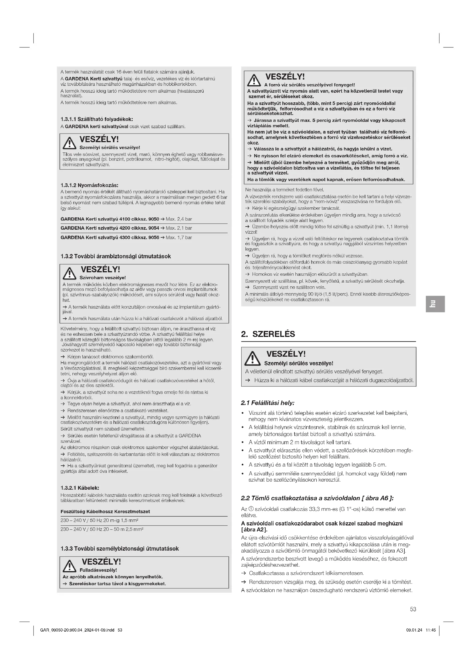 VESZÉLY!Szívroham veszélye!A termék működés közben elektromágneses mezőt hoz létre. Ez az elektro-mágneses mező befolyásolhatja az aktív vagy passzív orvosi implantátumok (pl.szívritmus-szabályozók) működését, ami súlyos sérülést vagy halált okoz- hat. v A termék használata előtt konzultáljon orvosával és az implantátum gyártó- jával. v A termék használata után húzza ki a hálózati csatlakozót a hálózati aljzatból. Követelmény, hogy a felállított szivattyú biztosan álljon, ne áraszthassa el víz és ne eshessen bele a szivattyúzandó vízbe. A szivattyú felállítási helye a szállított közegtől biztonságos távolságban (attól legalább 2m-re) legyen. Jóváhagyott személyvédő kapcsoló képében egy további biztonsági szerkezet is használható.v Kérjen tanácsot elektromos szakembertől.Ha megrongálódott a termék hálózati csatlakozóvezetéke, azt a gyártóval vagy aVevőszolgálatával, ill. megfelelő képzettséggel bíró szakemberrel kell kicserél-tetni, nehogy veszélyhelyzet álljon elő.v Óvja a hálózati csatlakozódugót és hálózati csatlakozóvezetéket a hőtől, olajtól és az éles szélektől.v Kérjük, a szivattyút soha ne a vezetéknél fogva emelje fel és rántsa ki a konnektorból.v Tegye olyan helyre a szivattyút, ahol nem áraszthatja el a víz.v Rendszeresen ellenőrizze a csatlakozó vezetéket.v Mielőtt használni kezdené a szivattyút, mindig vegye szemügyre (a hálózati csatlakozóvezetékre és a hálózati csatlakozódugóra különösen figyeljen).Sérült szivattyút nem szabad üzemeltetni.v Sérülés esetén feltétlenül vizsgáltassa át a szivattyút a GARDENA szervizzel.Az elektromos részeken csak elektromos szakember végezhet átalakításokat.v Feltöltés, szétszerelés és karbantartás előtt le kell választani az elektromos hálózatról.v Ha a szivattyúinkat generátorral üzemelteti, meg kell fogadnia a generátor gyártója által adott óva intéseket.1.3.2.1 Kábelek:Hosszabbító kábelek használata esetén azoknak meg kell felelniük a következő táblázatban feltüntetett minimális keresztmetszet értékeknek:Feszültség Kábelhossz Keresztmetszet230 – 240 V / 50 Hz 20 m-ig 1,5 mm²230 – 240 V / 50 Hz 20 – 50 m 2,5 mm²
