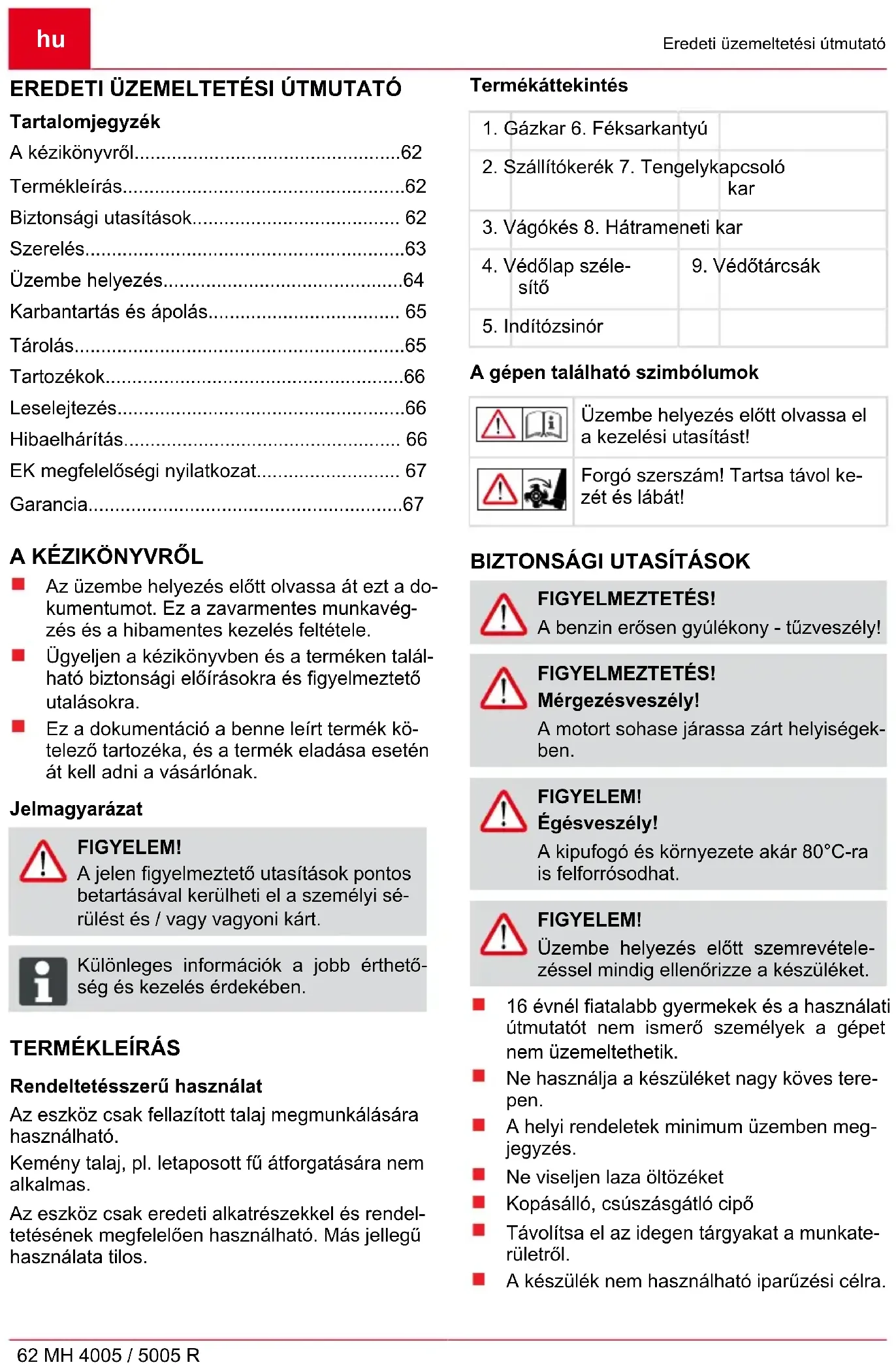 FIGYELMEZTETÉS! A benzin erősen gyúlékony - tűzveszély! FIGYELMEZTETÉS! Mérgezésveszély! A motort sohase járassa zárt helyiségek- ben. FIGYELEM! Égésveszély! A kipufogó és környezete akár 80°C-ra is felforrósodhat. FIGYELEM! Üzembe helyezés előtt szemrevétele- zéssel mindig ellenőrizze a készüléket. 16 évnél fiatalabb gyermekek és a használati útmutatót nem ismerő személyek a gépet nem üzemeltethetik. Ne használja a készüléket nagy köves tere- pen. A helyi rendeletek minimum üzemben meg- jegyzés. Ne viseljen laza öltözéket Kopásálló, csúszásgátló cipő Távolítsa el az idegen tárgyakat a munkate- rületről. A készülék nem használható iparűzési célra.Biztonsági utasítások 441442_a 63 A készüléket ne használja, ha alkohol, kábítószerek vagy gyógyszerek hatása alatt áll. Vegye figyelembe az üzemeltetési időre vo- natkozó nemzeti rendelkezéseket! Csak kielégítő nappali fény vagy mestersé- ges megvilágítás mellett szabad dolgozni. FIGYELEM! Üzembe helyezés előtt szemrevétele- zéssel mindig ellenőrizze a készüléket. A berendezést csak akkor használja, ha műs- zakilag kifogástalan állapotban van. Ügyeljen arra, hogy kezelő a felelős az olyan balesetekért és anyagi károkért, melyeket más személyeknek vagy azok tulajdonában okozhatnak. A biztonsági és védelmi felszereléseket tilos kikapcsolni! Ne közelítse meg a forgó részeket a kezével vagy a lábával. A készüléket tilos megemelni vagy vinni, ami- kor működésben van a motor Munkavégzés közben ügyeljen arra, hogy biztonságosan álljon. A felhasználó felelős a balesetek és más em- berek tulajdonát. A készüléket tilos felügyelet nélkül hagyni. Tartsa tisztán a kipufogót és a motort A benzint csak erre alkalmas tartályokban tárolja Tankolás szabadban. Sérült vagy tartály tanksapka csere. A sérült vagy kopott alkatrészeket eredeti pó- talkatrészekkel cserélje ki. Szerkezeti és kivitelezési változtatások joga fenntartva. A motor indításakor ne tartózkodjon senki a készülék, ill. a munkaszerszámok (vágókés) előtt - a vágókés hajtását ki kell kapcsolni. Csak kikapcsolt motor és álló vágókés mellett szerelje fel és le a szállítókereket, ill. állítsa a féket. Felrakott szállítókerékkel járatás közben ál- lítsa le a motort, és várja meg, hogy megáll- janak a vágókések. Az eszköz csak a vezetőnyél által meg- határozott biztonsági távolság betartásával használható. A lejtőre merőlegesen kell dolgozni. Ne dolgozzon vele lejtőn fel vagy le, és ne legyen 10°-nál nagyobb a dőlése. Ha jár a motor vagy forró a gép, nem szabad kinyitni az üzemanyag tartályt és nem szabad tankolni. Tankoláshoz használjon tölcsért vagy betöl- tőcsövet, hogy ne kerüljön üzemanyag a mo- torra, a házra vagy a talajra. Ha benzin ömlött ki, akkor a motor nem in- dítható. A készüléket tisztítsa meg és min- den gyújtási kísérletet mindaddig mellőzzön, amíg a benzingőz elpárolog. Biztonsági okokból soha ne használja a mo- tor kopott vagy sérült alkatrészeket. Az ilyen részek mindig legyen helyére, nem javítható. Használja OEM alkatrészek. Alkatrészek gy- engébb minőségű károsíthatja a motort és veszélyeztetheti a biztonságot. A sérült kipufogódobokat cserélje ki. A motor szabályozási beállításait ne módo- sítsa. SZERELÉS Féksarkantyú szerelése (2) A féksarkantyú hosszú oldalát (2-1) tolja a keretkar végdarabjába és a fogó (2-2) elfor- dításával állítsa le. Szállítókerék szerelése (3) A szállítókerék (3-1) csak a motoros kapa szál- lítására használható. A szállítókerék (3-1) feltolása a féksarkanty- úra és rögzítése csillagcsavarral (3-2). Munkavégzés közben le kell szerelni a szál- lítókereket: Lazítsa meg a szárnyascsavart (3-2), és ve- gye le a szállítókereket. Nyéltartó felszerelése (4) A tartót (4-1) a lapra helyezett 4 csavarral (4-2), az alátét csavarokkal (4-3) és az anyák- kal (4-4) szerelje fel a motoros kapára. Kábelátvezetés (4-5) szerelése a (4)-es ábra szerint.hu Szerelés 64 MH 4005 / 5005 R Nyél felszerelése (5) A 2 nyélcső (5-1) rögzítése átdugható csavar- ral (5-2), távtartó darabbal (5-3), alátét csa- varokkal (5-4) és anyával (5-5) a nyél felső lyukában. Ugyanez az eljárás arra a lyukra (5-9), ame- lybe a másik csavart (5-2), a távtartó darabot (5-3) és a 4 mm-es alátét csavart 4 mm (5-6) a forgógombba (5-7) és a másik forgógombot (5-8) anyával az (5)-ös ábrán mutatott sor- rendben behelyezzük. ADVICE A bowdenhuzalok kidörzsölődésének megelőzésére a bowdenhuzalok között átdugható csavarokat (5-2) és távtartó darabot (5-3) kell átvezetni! További információkért lásd a nyél beál- lítását. Gázkar felszerelése (6) A gázkar rögzítése a nyélen csavarral és hat- lapú anyával. Vezérlőkábel felszerelése (7) A vezérlőkábel (7-1) felcsavarozása csavar- ral (7-2) a jobb nyélre (7-3). FIGYELEM! A nyelet (7-3) vezesse át a két vezér- lőkábel között.