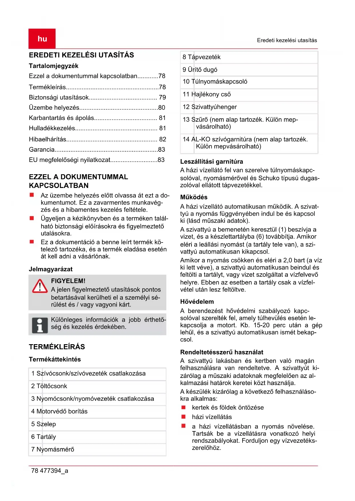 Termékáttekintés 1 Szívócsonk/szívóvezeték csatlakozása 2 Töltőcsonk 3 Nyomócsonk/nyomóvezeték csatlakozása 4 Motorvédő borítás 5 Szelep 6 Tartály 7 Nyomásmérő 8 Tápvezeték 9 Ürítő dugó 10 Túlnyomáskapcsoló 11 Hajlékony cső 12 Szivattyúhenger 13 Szűrő (nem alap tartozék. Külön mep- vásárolható) 14 AL-KO szívógarnitúra (nem alap tartozék. Külön mepvásárolható) Leszállítási garnitúra A házi vízellátó fel van szerelve túlnyomáskapc- solóval, nyomásmérővel és Schuko típusú dugas- zolóval ellátott tápvezetékkel. Működés A házi vízellátó automatikusan működik. A szivat- tyú a nyomás függvényében indul be és kapcsol ki (lásd műszaki adatok). A szivattyú a bemenetén keresztül (1) beszívja a vizet, és a készlettartályba (6) továbbítja. Amikor eléri a leállási nyomást (a tartály tele van), a szi- vattyú automatikusan kikapcsol. Amikor a nyomás csökken és eléri a 2,0 bart (a víz ki lett véve), a szivattyú automatikusan beindul és feltölti a tartályt, vagy vizet szolgáltat a vízfelvevő helyre. Ebben az esetben a tartály csak a vízfel- vétel után lesz feltöltve. Hővédelem A berendezést hővédelmi szabályozó kapc- solóval szerelték fel, amely túlhevülés esetén le- kapcsolja a motort. Kb. 15-20 perc után a gép lehűl, és a szivattyú automatikusan ismét bekap- csol. Rendeltetésszerű használat A szivattyú lakásban és kertben való magán felhasználásra van rendeltetve. A szivattyút ki- zárólag a műszaki adatoknak megfelelően az al- kalmazási határok keretei közt használja. A készülék kizárólag a következő felhasználáso- kra alkalmas: kertek és földek öntözése házi vízellátás a házi vízellátásban a nyomás növelése. Tartsák be a vízellátásra vonatkozó helyi rendszabályokat. Forduljon egy vízvezetéks- zerelőhöz.Termékleírás 477394_a 79 A készülék kizárólag a következő folyadékok szi- vattyúzására alkalmas: tiszta víz esővíz Lehetséges hibás használat A szivattyút nem szabad folyamatos üzemben használni. A szivattyú nem alkalmas a következő folyadékok szivattyúzására: vóvíz sós víz folyékony élelmiszerek maró hatású szerek és vegyszerek savas, gyúlékony, robbanó illetve illanó folya- dékok 35°C-nál melegebb folyadékok homokos víz, illetve csiszoló folyadékok