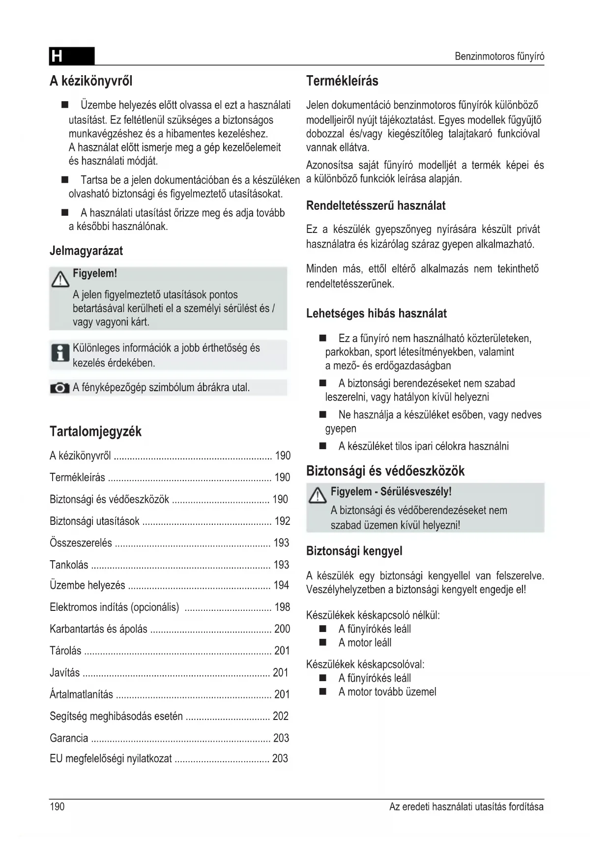 - Benzinmotoros fűnyíró Tartalomjegyzék A kézikönyvről p. 190