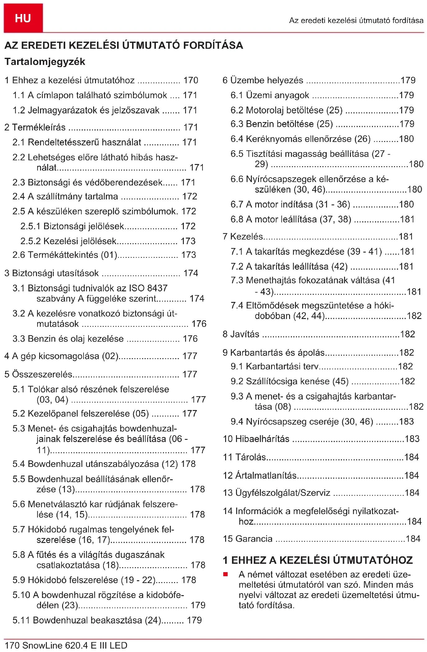 A termék-összefoglaló (01) áttekintést ad a ké- szülékről. Sz. Alkatrész 1 Fűthető fogantyúk 2 Kuplungkioldó a csigahajtáshoz 3 Kuplungkioldó a menethajtáshoz 4 Kézi hajtókar a kidobási irány átállításá- hoz 5 Kar a kidobómagasság vezérléséhez 6 Menetválasztó kar, 6 előre- és 2 hátramenet 7 Fogantyúfűtés kapcsolója 8 Tartalék nyírócsapszeg 9 Terelőlemez a hókidobón a kidobóma- gasság beállításához 10 Hókidobó benyúlásgátlóval 11 Világítás 12 Tanksapka 13 Olajbetöltő fedele 14 Pajzs 15 Tisztítószerszám (a pajzsra felszerelve) 16 Kidobókerék 17 Szállítócsiga 18 Tisztítólemez 19 Állítható magasságú csúszótalp 20 A gyújtógyertya csatlakozófejeHU 174 SnowLine 620.4 E III LED Biztonsági utasítások