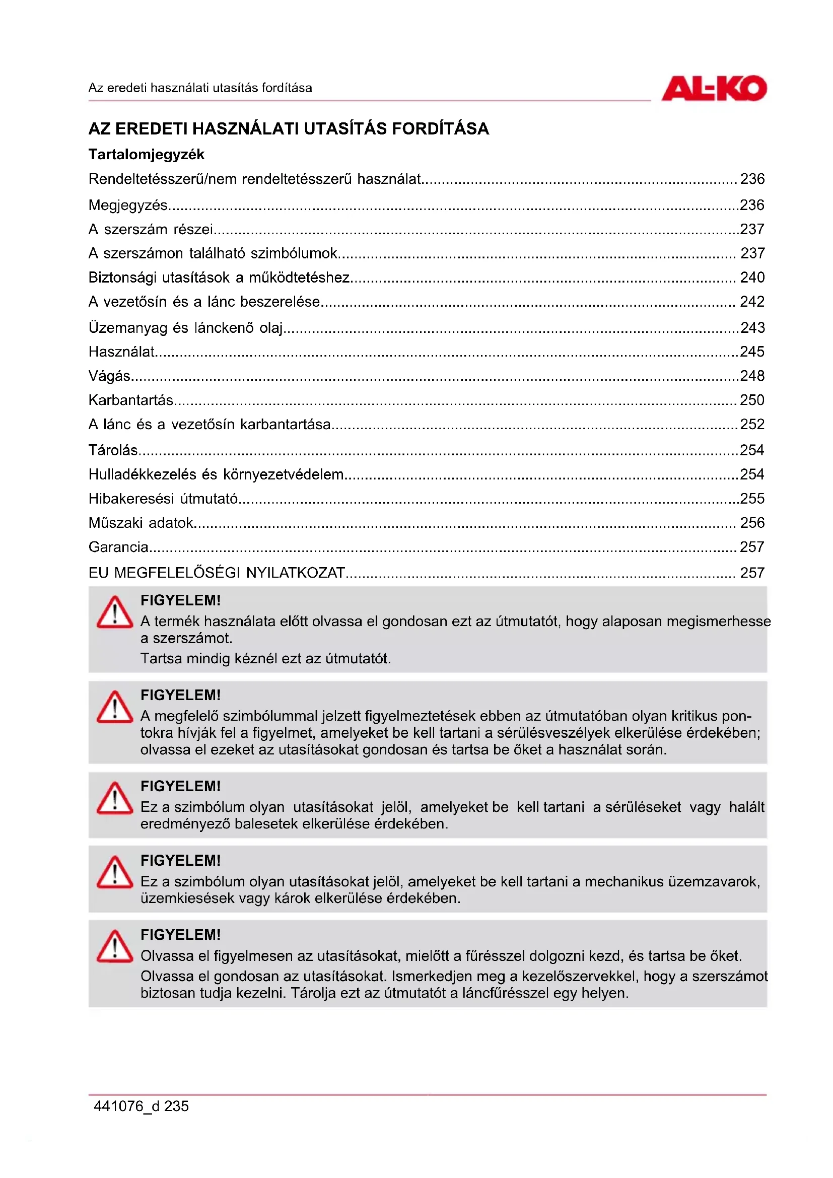 - Intertek Deutschland GmbH Stangenstr. 1 D-70771 Leinfelden-Echterdingen Nr. 0905 Intertek Deutschland GmbH Stangenstr. 1 70771 Leinfelden-Echterdingen Nr. 0905 Wolfgang Hergeth Managing DirectorAz eredeti használati utasítás fordítása 441076_d 235 AZ EREDETI HASZNÁLATI UTASÍTÁS FORDÍTÁSA Tartalomjegyzék Rendeltetésszerű/nem rendeltetésszerű használat p. 236