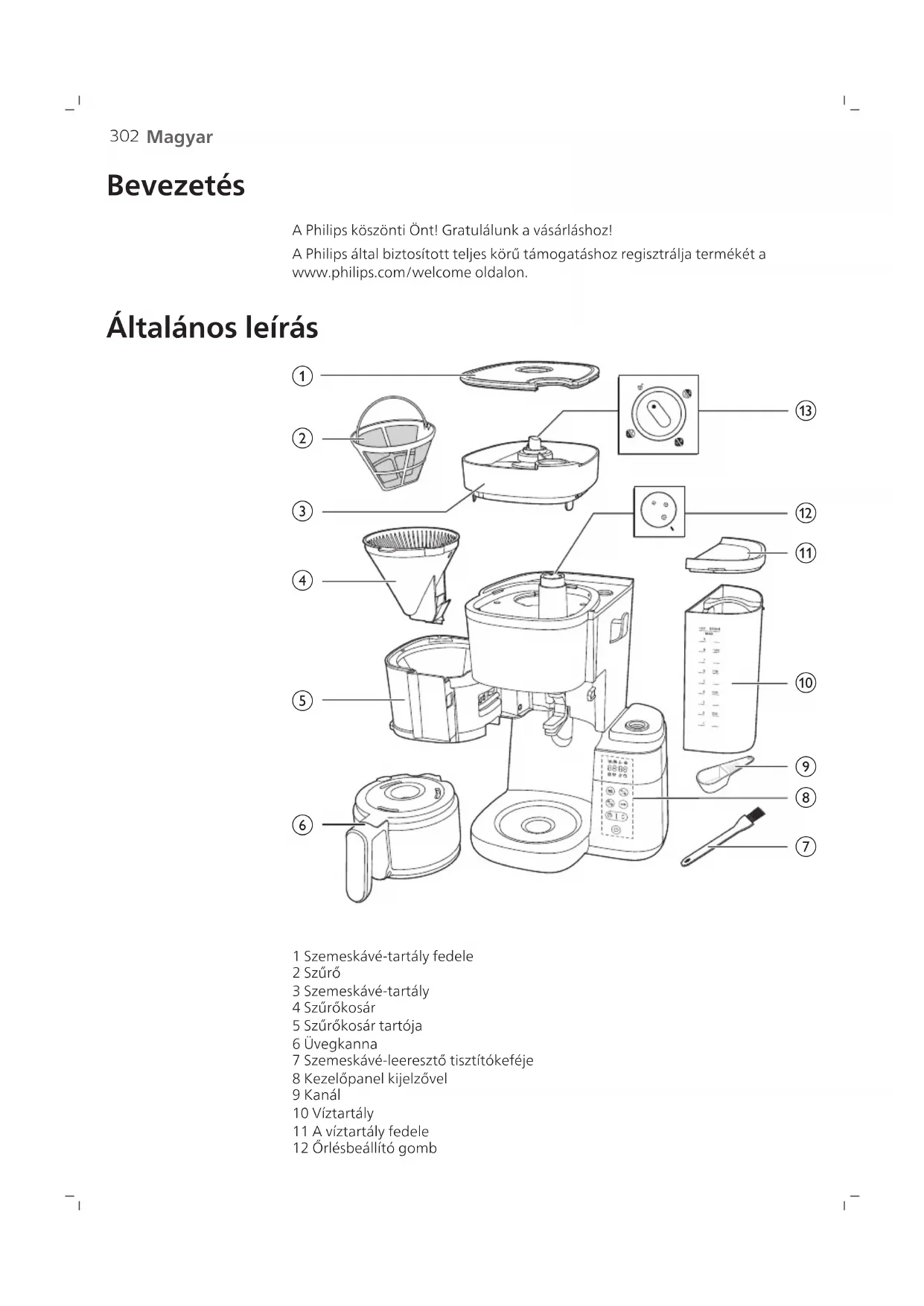 1 Szemeskávé-tartály fedele 2 Szűrő 3 Szemeskávé-tartály 4 Szűrőkosár 5 Szűrőkosár tartója 6 Üvegkanna 7 Szemeskávé-leeresztő tisztítókeféje 8 Kezelőpanel kijelzővel 9 Kanál 10 Víztartály 11 A víztartály fedele 12 Őrlésbeállító gomb303 Magyar 13 Tartályválasztó gomb Kezelőpanel Bekapcsoló gomb Időzítő gomb és időbeállító nyíl gomb Indítás/szüneteltetés gomb Tisztítás gomb Előőrölt kávé és kávéerősség gomb Csészeválasztó gomb Kijelző ikon Csészék száma Melegen tartás mód Előőrölt kávé Kávéerősség Vízkőmentesítés Szűrőtisztításra vonatkozó riasztás304 Magyar Alacsony vízszint Időzítő Idő kijelzője Az első két számjegy az órákat, az utolsó két számjegy pedig a perceket jelzi. Fordítsa a gombot nyitott állásba, ekkor el tudja távolítani a szemeskávé-tartályt a készülékről. Ezzel a gombbal választhatja ki az őrlés finomságát; a nagyobb méret durvább őrlést jelez. Kanna üzemmód A cseppzáró funkció kanna üzemmódban működik. Megjegyzés: A kanna eltávolításakor a főzés nem áll le. Ha 20 másodpercen belül nem helyezi vissza a kannát a készülékbe, a szűrőkosár túlcsordul. Csésze üzemmód Annak érdekében, hogy a főzési ciklus befejeződése után megakadályozza a csepegést, nyissa ki a cseppzárót. Ehhez manuálisan állítsa át a gombot csésze üzemmódból kanna üzemmódba. Megjegyzés: Felmelegedés közben a hideg kerámia bögre hőt von el a kávétól, ezért forró vízzel melegítse elő a bögrét. Fontos Figyelmeztetés
