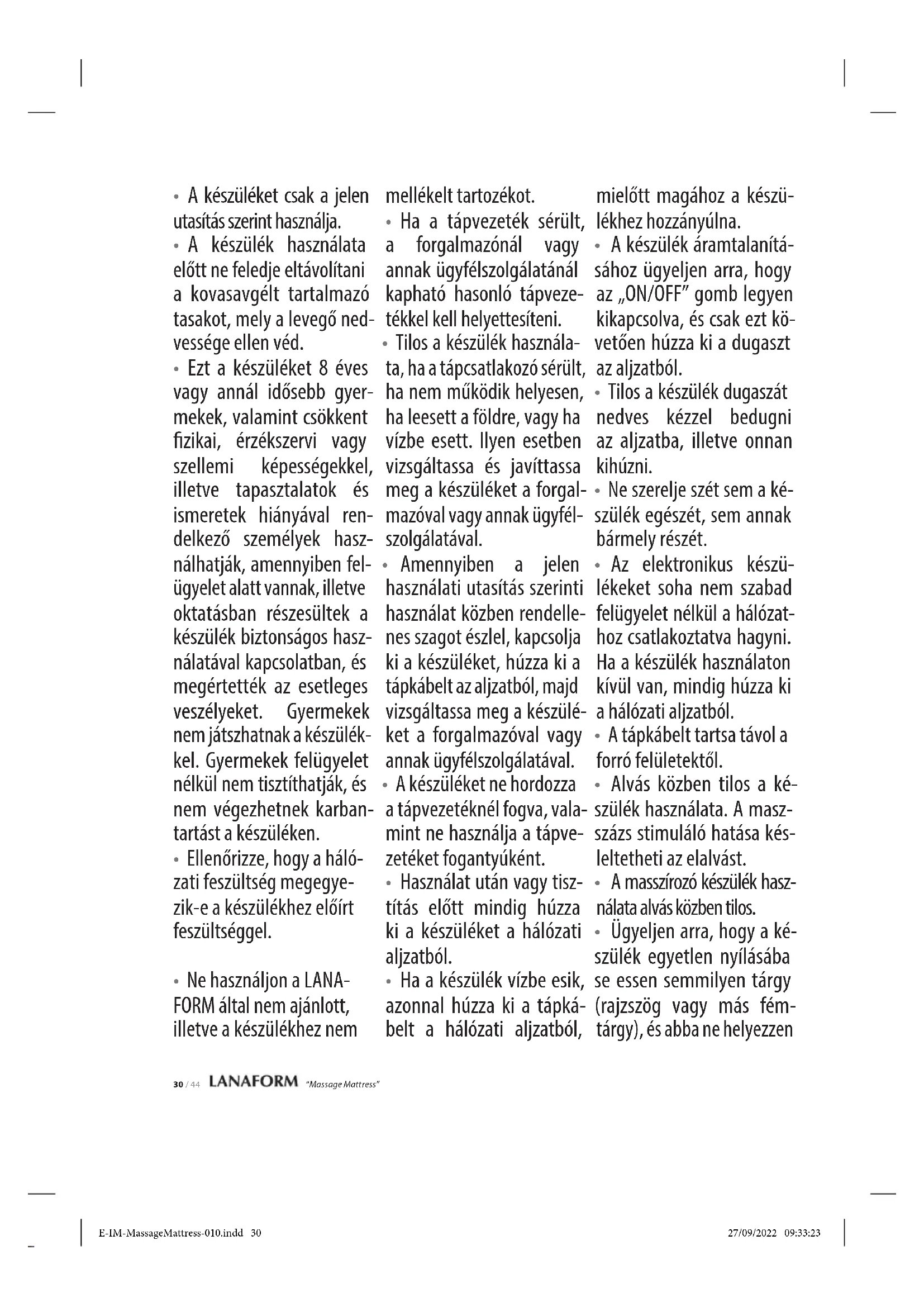Ügyeljen arra, hogy a ké- szülék egyetlen nyílásába se essen semmilyen tárgy (rajzszög vagy más fém- tárgy), és abba ne helyezzen E-IM-MassageMattress-010.indd 30E-IM-MassageMattress-010.indd 30 27/09/2022 09:33:2327/09/2022 09:33:23“Massage Mattress” 31 / 44 be semmit.