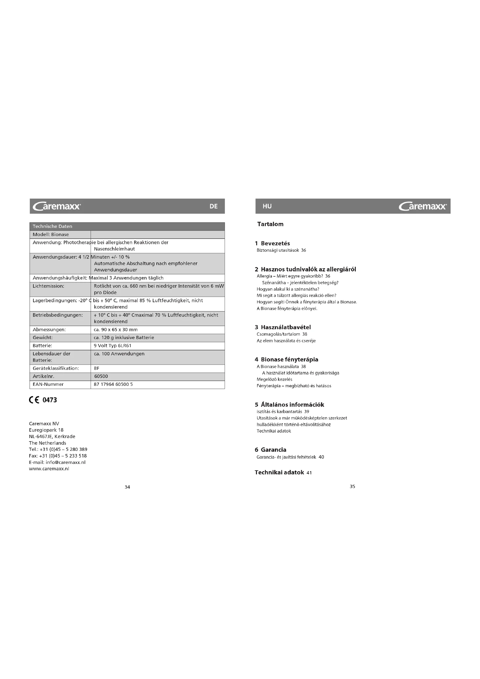 Caremaxx NV Euregiopark 18 NL-6467JE, Kerkrade The Netherlands Tel.: +31 (0)45 – 5 280 389 Fax: +31 (0)45 – 5 233 518 E-mail: info@caremaxx.nl www.caremaxx.nl Tartalom 1 Bevezetés Biztonsági utasítások 36 2 Hasznos tudnivalók az allergiáról Allergia – Miért egyre gyakoribb? 36 Szénanátha – jelentéktelen betegség? Hogyan alakul ki a szénanátha? Mi segít a túlzott allergiás reakció ellen? Hogyan segíti Önnek a fényterápia által a Bionase. A Bionase fényterápia elônyei. 3 Használatbavétel Csomagolás/tartalom 38 Az elem használata és cseréje 4 Bionase fényterápia A Bionase használata 38 A használat idôtartama és gyakorisága Megelôzô kezelés Fényterápia – megbízható és hatásos 5 Általános információk isztítás és karbantartás 39 Utasítások a már mûködésképtelen szerkezet hulladékként történô eltávolításához Technikai adatok 6 Garancia Garancia- és javítási feltételek 40 Technikai adatok 41 Technische Daten Modell: Bionase Anwendung: Phototherapie bei allergischen Reaktionen der Nasenschleimhaut Anwendungsdauer: 4 1/2 Minuten +/- 10 % Automatische Abschaltung nach empfohlener Anwendungsdauer Anwendungshäufigkeit: Maximal 3 Anwendungen täglich Lichtemission: Rotlicht von ca. 660 nm bei niedriger Intensität von 6 mW pro Diode Lagerbedingungen: -20º C bis + 50º C, maximal 85 % Luftfeuchtigkeit, nicht kondensierend Betriebsbedingungen: + 10º C bis + 40º Cmaximal 70 % Luftfeuchtigkeit, nicht kondensierend Abmessungen: ca. 90 x 65 x 30 mm Gewicht: ca. 120 g inklusive Batterie Batterie: 9 Volt Typ 6LR61 Lebensdauer der Batterie: ca. 100 Anwendungen Geräteklassifikation: BF Artikelnr. 60500 EAN-Nummer 87 17964 60500 536