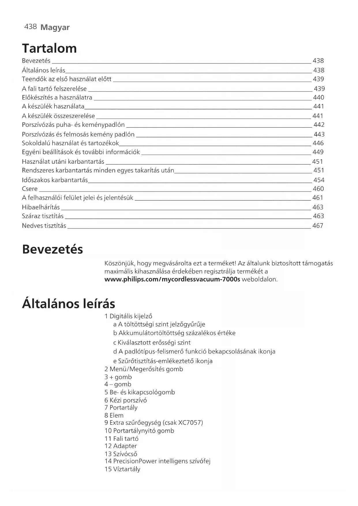 Magyar Tartalom Bevezetés _________________________________________________________________________________ 438 Általános leírás_____________________________________________________________________________ 438 Teendők az első használat előtt ______________________________________________________________ 439 A fali tartó felszerelése ______________________________________________________________________ 439 Előkészítés a használatra ____________________________________________________________________ 440 A készülék használata_______________________________________________________________________ 441 A készülék összeszerelése ___________________________________________________________________ 441 Porszívózás puha- és keménypadlón __________________________________________________________ 442 Porszívózás és felmosás kemény padlón _______________________________________________________ 443 Sokoldalú használat és tartozékok____________________________________________________________ 446 Egyéni beállítások és további információk _____________________________________________________ 449 Használat utáni karbantartás ________________________________________________________________ 451 Rendszeres karbantartás minden egyes takarítás után___________________________________________ 451 Időszakos karbantartás______________________________________________________________________ 454 Csere _____________________________________________________________________________________ 460 A felhasználói felület jelei és jelentésük _______________________________________________________ 461 Hibaelhárítás ______________________________________________________________________________ 463 Száraz tisztítás _____________________________________________________________________________ 463 Nedves tisztítás ____________________________________________________________________________ 467 Bevezetés Köszönjük, hogy megvásárolta ezt a terméket! Az általunk biztosított támogatás maximális kihasználása érdekében regisztrálja termékét a www.philips.com/mycordlessvacuum-7000s weboldalon. Általános leírás 1 Digitális kijelző a A töltöttségi szint jelzőgyűrűje b Akkumulátortöltöttség százalékos értéke c Kiválasztott erősségi szint d A padlótípus-felismerő funkció bekapcsolásának ikonja e Szűrőtisztítás-emlékeztető ikonja 2 Menü/Megerősítés gomb 3 + gomb 4 – gomb 5 Be- és kikapcsológomb 6 Kézi porszívó 7 Portartály 8 Elem 9 Extra szűrőegység (csak XC7057) 10 Portartálynyitó gomb 11 Fali tartó 12 Adapter 13 Szívócső 14 PrecisionPower intelligens szívófej 15 Víztartály439 Magyar 16 Mikroszálas felmosókendő 17 Mini turbókefe (csak XC7055, XC7057) 18 Kombinált kefe 19 Puha kefe (csak XC7057) 20 Kárpittisztító kefe (csak XC7055, XC7057) 21 Réstisztító szívófej Teendők az első használat előtt A fali tartó felszerelése 1 Fordítsa kifelé a fali tartót, és oldja ki a szürke kart. Dugja be a töltőcsatlakozót úgy, hogy a fémrésze látható legyen, és felfelé mutasson a fali tartó elülső oldalán. 2 Vezesse el a kábelt az erre a célra kialakított vájatban. 3 Zárja vissza a szürke kart. A szürke zár megfelelő rögzítése esetén egy kattanást kell hallania. 110 ± 2 cm 4 Szilárdan szerelje fel a fali tartót a fal kívánt pontjára úgy, hogy a rögzítőcsavarok nyílásai körülbelül 110 cm-re legyenek a padlótól. Figyelem: Óvatosan fúrjon lyukakat a falba a fali tartó rögzítéséhez, nehogy áramütés érje!440 Magyar Megjegyzés: Ellenőrizze, hogy a fali tartó elég magasan van-e ahhoz, hogy a készülék úgy lógjon a falon, hogy a szívófej nem ér hozzá a padlóhoz. 5 Ha kiválasztotta a megfelelő helyet és magasságot a készülék tárolására és töltésére, erősen húzza meg a csavarokat, és rögzítse a helyére a fali tartót. Előkészítés a használatra A készülék lítiumion akkumulátorral rendelkezik. A teljesen lemerült akkumulátor feltöltése körülbelül 6 órát vesz igénybe. 1 Helyezze fel az akkumulátort a készülékházra ügyelve a megfelelő rögzítésre, amit egy kattanás jelez. MAX 40⁰C MIN 5⁰C 2 Helyezze a készüléket a felszerelt fali tartóra, és töltse fel. Vigyázat! A készüléket 5 °C és 40 °C közötti hőmérsékleten töltse és tárolja.441 Magyar Megjegyzés: A töltőkábelt közvetlenül a kézi porszívóhoz is csatlakoztathatja. Ehhez fektesse a készüléket vízszintes és stabil felületre.