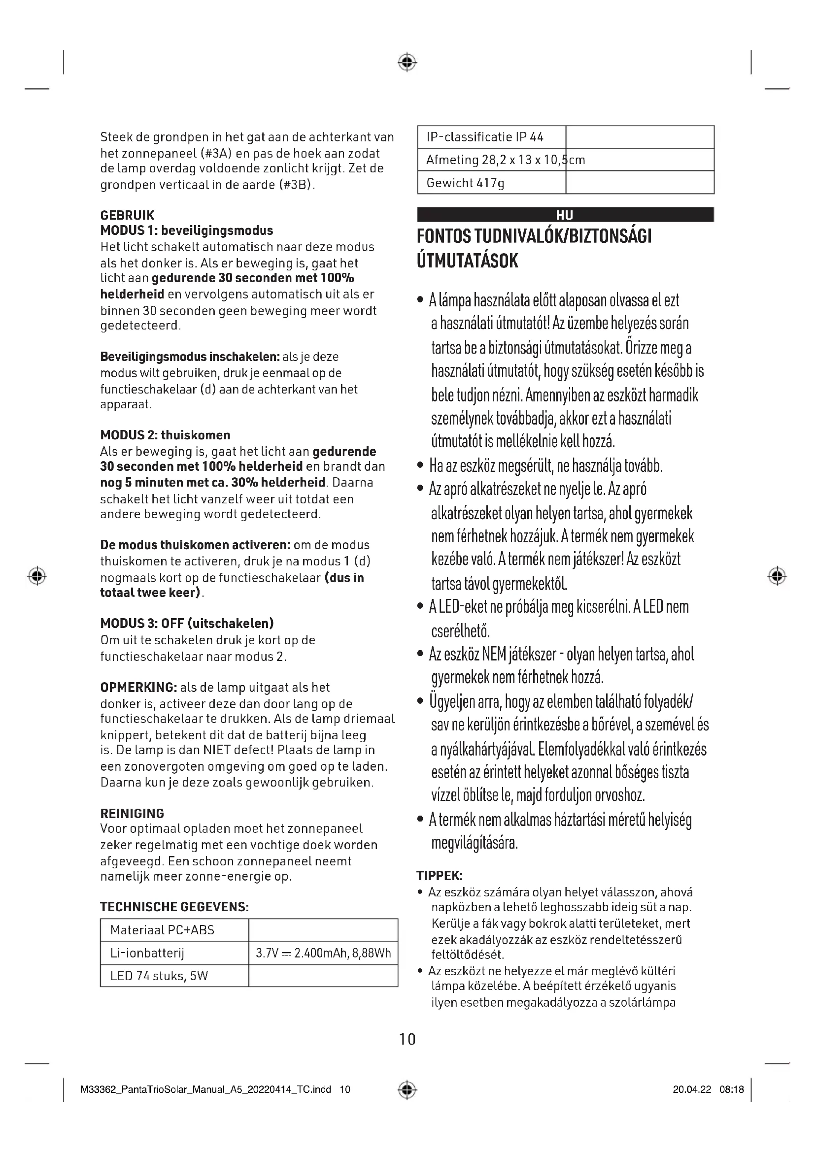 - Az eszközt ne helyezze el már meglévő kültéri lámpa közelébe. A beépített érzékelő ugyanis ilyen esetben megakadályozza a szolárlámpa M33362_PantaTrioSolar_Manual_A5_20220414_TC.indd 10M33362_PantaTrioSolar_Manual_A5_20220414_TC.indd 10 20.04.22 08:1820.04.22 08:1810