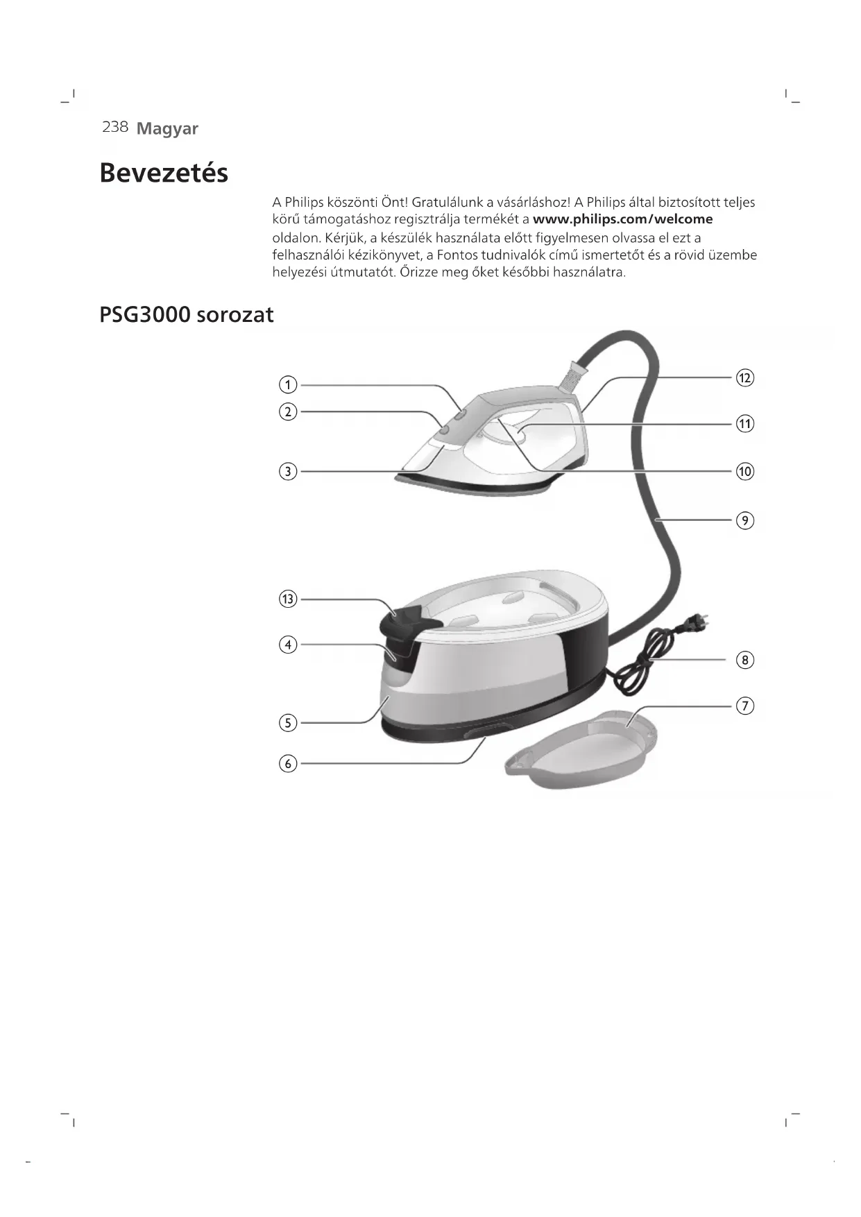 Magyar Bevezetés A Philips köszönti Önt! Gratulálunk a vásárláshoz! A Philips által biztosított teljeskörű támogatáshoz regisztrálja termékét a www.philips.com/welcomeoldalon. Kérjük, a készülék használata előtt figyelmesen olvassa el ezt afelhasználói kézikönyvet, a Fontos tudnivalók című ismertetőt és a rövid üzembehelyezési útmutatót. Őrizze meg őket későbbi használatra. PSG3000 sorozat