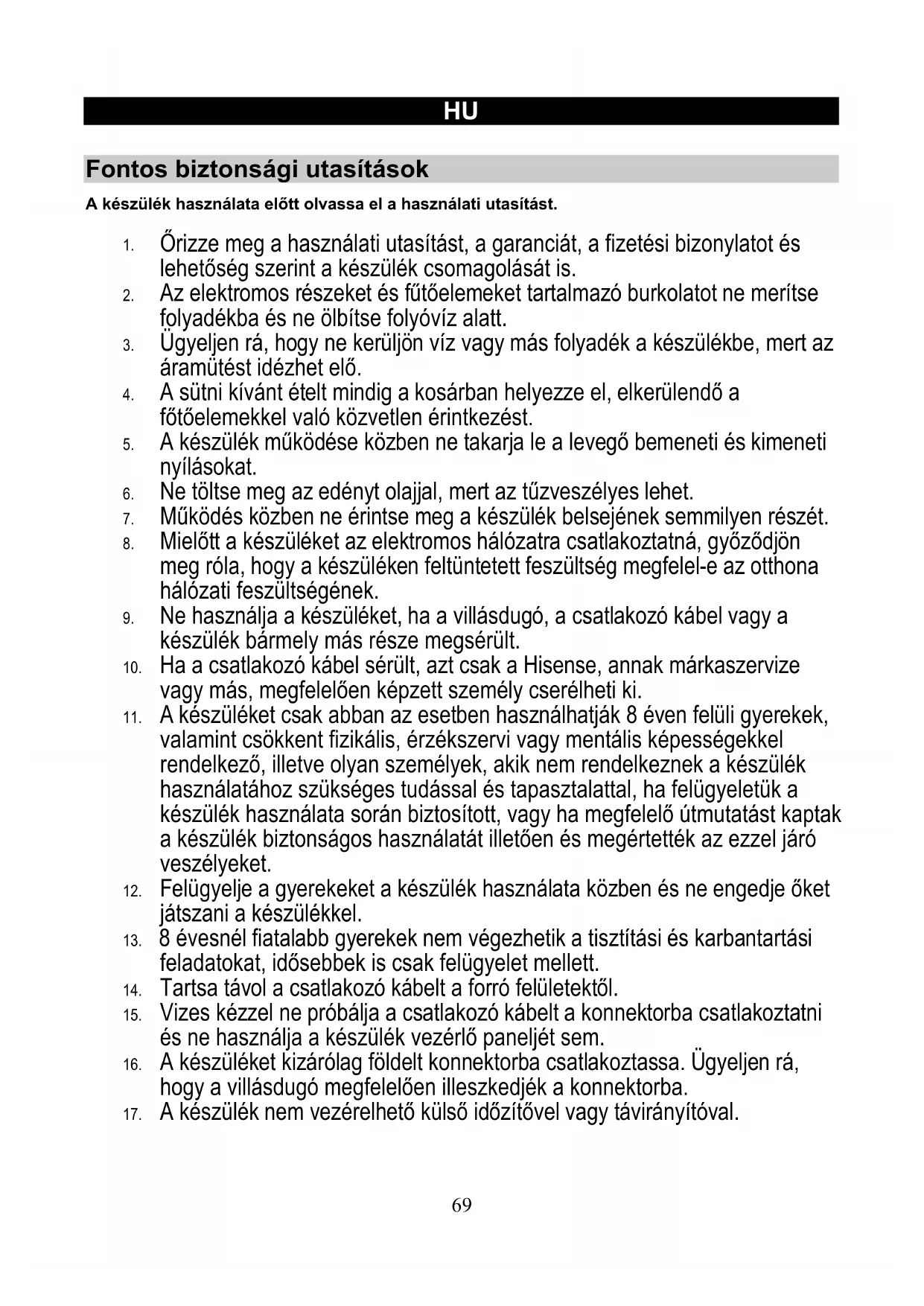 További információkért vagy probléma esetén vegye fel a kapcsolatot az országában működő Hisense telefonos ügyfélszolgálattal (ezek telefonszáma a nemzetközi garancialevélen található meg). Amennyiben az ön országában nem működik ilyen ügyfélszolgálat, vegye fel a kapcsolatot a helyi Hisense márkakereskedővel vagy a Hisense kis háztartási készülékek osztályával. Kizárólag személyes használatra! SOK ÖRÖMET KÍVÁN ÖNNEK A KÉSZÜLÉK HASZNÁLATA SORÁN! A módosítások jogát fenntartjuk.81