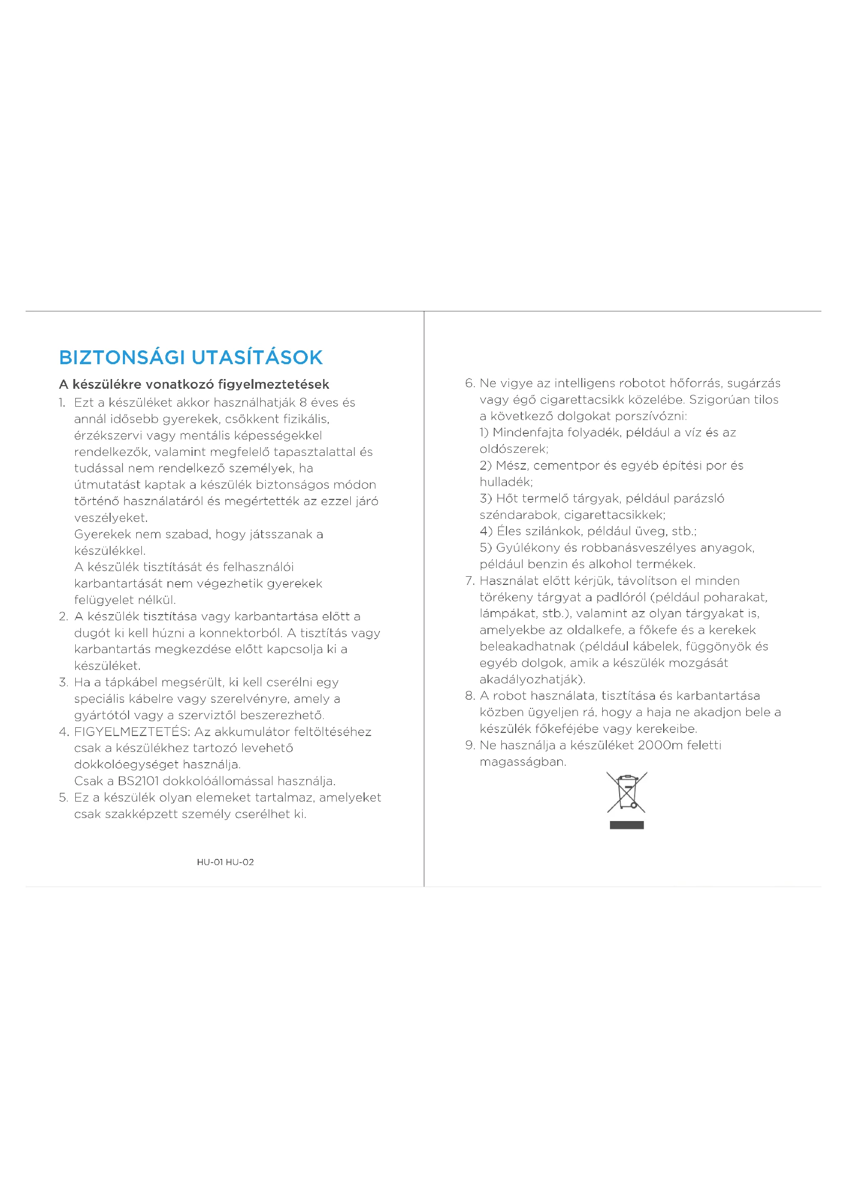 Az akkumulátor eltávolítása előtt a készüléket ki kell kapcsolni. Kérjük, ne szerelje szét az akkumulátort sajátkezűleg. Ha az akkumulátor cseréje válik szükségessé, forduljon a vevőszolgálathoz. A használt akkumulátor ártalmatlanítását a helyi törvényeknek és előírásoknak megfelelően végezze el. Ne szerelje szét, ne nyissa ki és ne darabolja fel az akkumulátort. Ne tegye ki az akkumulátorokat hőnek vagy tűznek. Kerülje a közvetlen napfényben való tárolást. Ne okozzon rövidzárlatot az akkumulátorban. Ne tárolja véletlenszerűen az akkumulátorokat olyan helyen, ahol rövidzárlatot okozhatnak egymásban vagy más fémtárgyak rövidzárlatot okozhatnak bennük. miután a robotporszívó visszatért a talphoz. Figyelmeztetés: Az akkumulátor töltő (dokkoló talp) nem alkalmas újratölthető akkumulátorok töltésére. FIGYELEM: A hőkioldó véletlen visszaállításából eredő veszélyek elkerülése érdekében a készüléket nem szabad külső kapcsolóeszközön, például időzítőn keresztül táplálni, vagy a közmű által rendszeresen be- és kikapcsolt áramkörhöz csatlakoztatni.