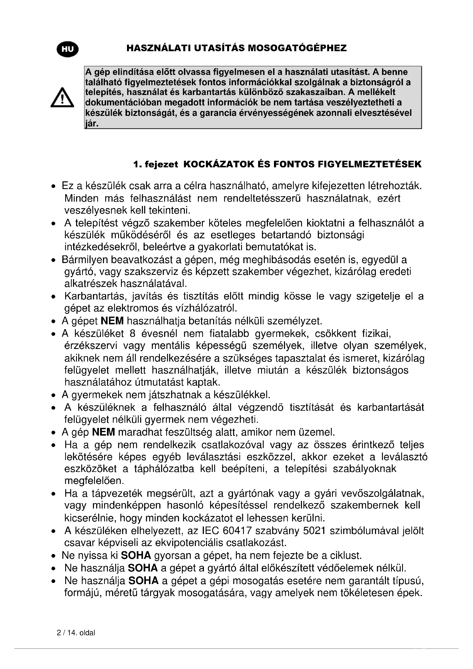 A gép elindítása előtt olvassa figyelmesen el a használati utasítást. A benne található figyelmeztetések fontos információkkal szolgálnak a biztonságról a telepítés, használat és karbantartás különböző szakaszaiban. A mellékelt dokumentációban megadott információk be nem tartása veszélyeztetheti a készülék biztonságát, és a garancia érvényességének azonnali elvesztésével jár.