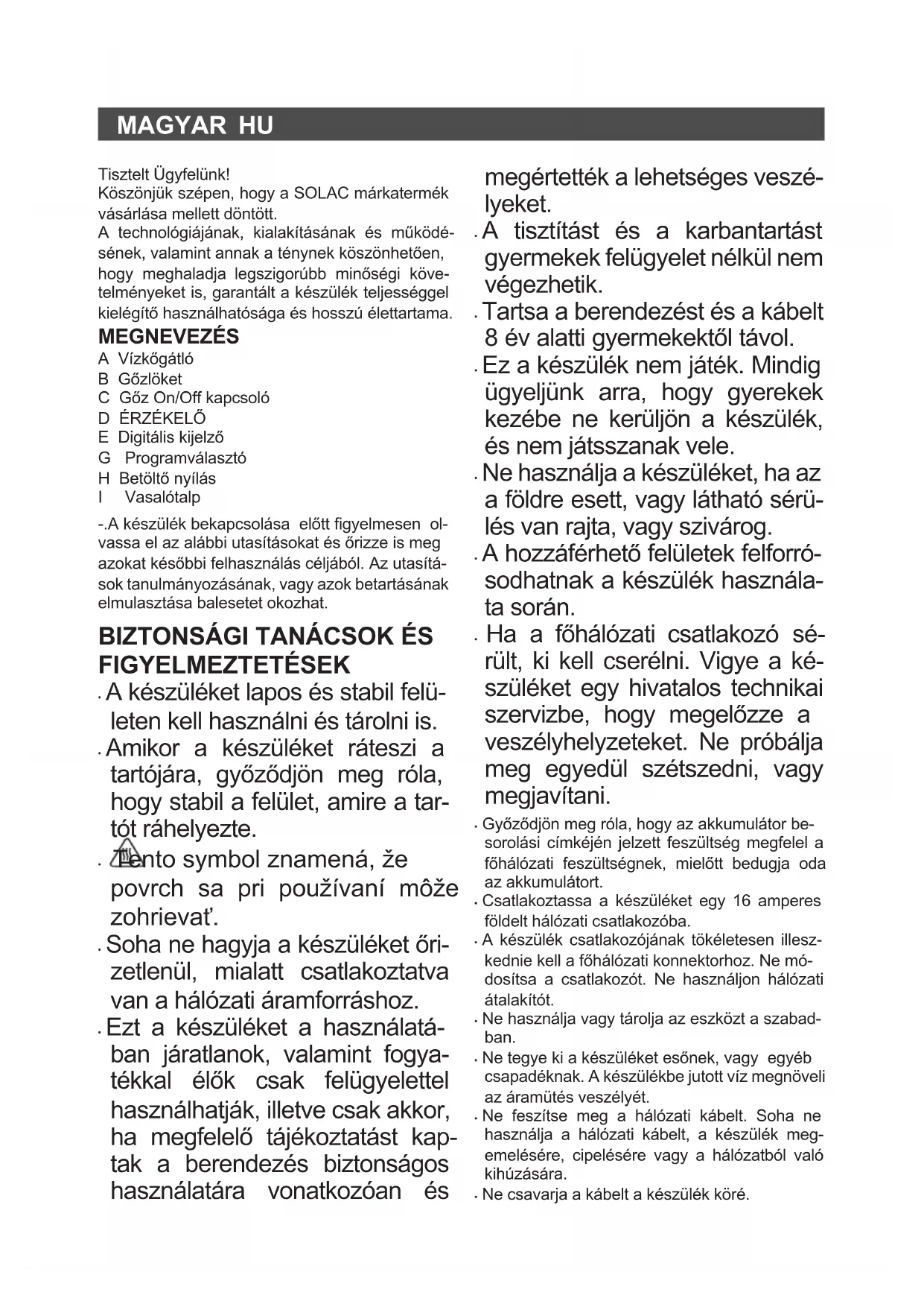 E Digitális kijelző G Programválasztó H Betöltő nyílás I Vasalótalp -.A készülék bekapcsolása előtt gyelmesen ol- vassa el az alábbi utasításokat és őrizze is meg azokat későbbi felhasználás céljából. Az utasítá- sok tanulmányozásának, vagy azok betartásának elmulasztása balesetet okozhat.