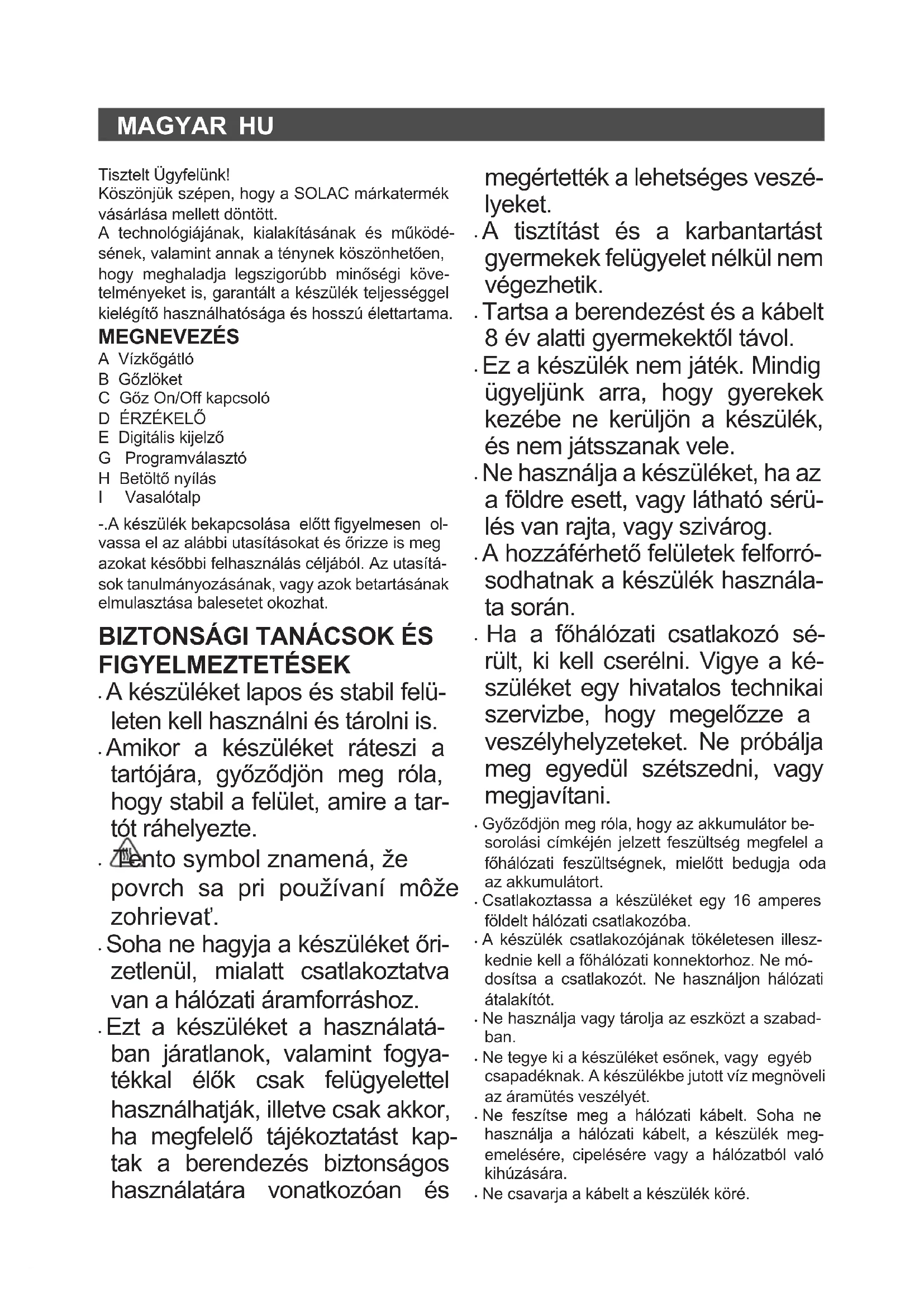 E Digitális kijelző G Programválasztó H Betöltő nyílás I Vasalótalp -.A készülék bekapcsolása előtt gyelmesen ol- vassa el az alábbi utasításokat és őrizze is meg azokat későbbi felhasználás céljából. Az utasítá- sok tanulmányozásának, vagy azok betartásának elmulasztása balesetet okozhat.