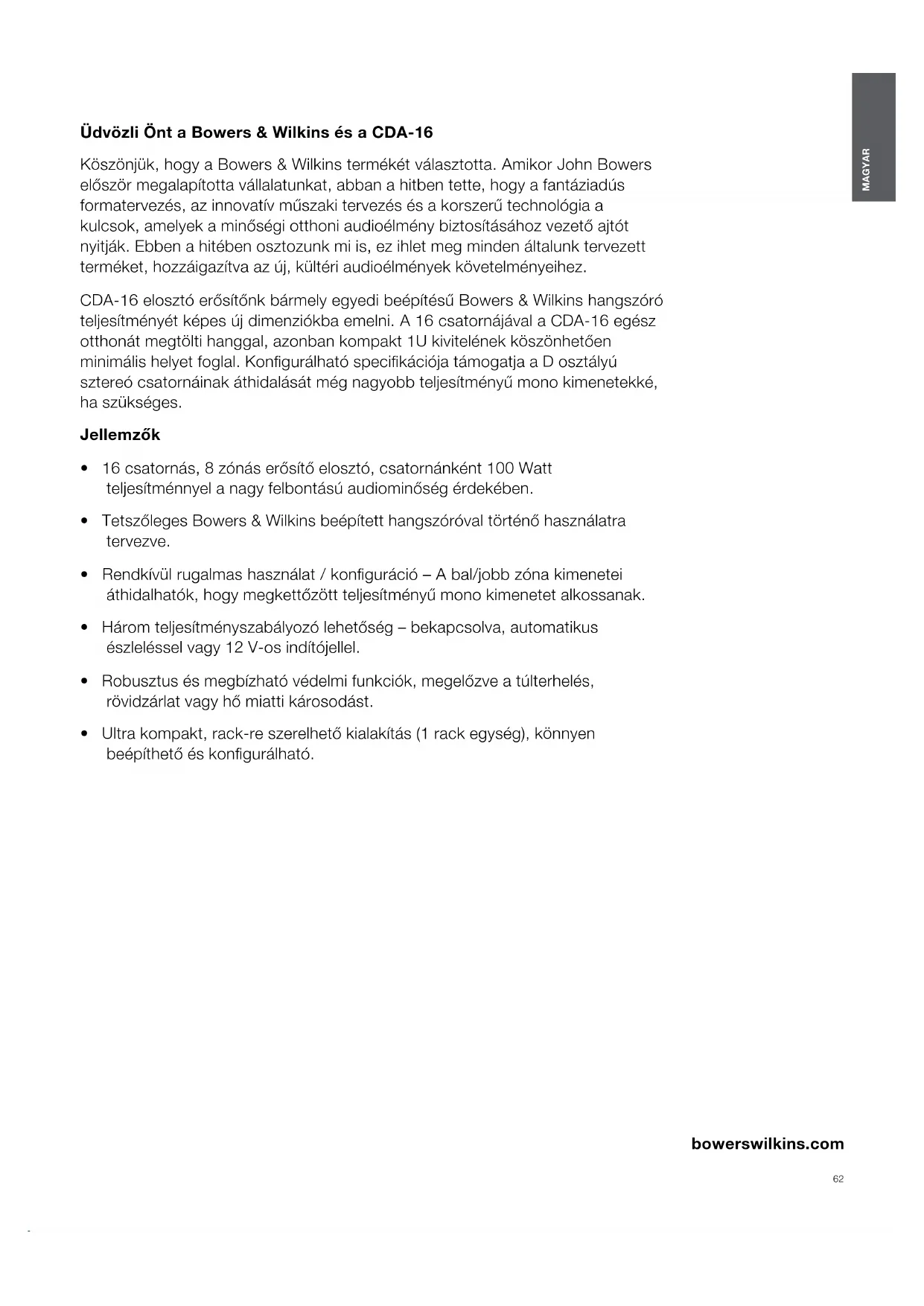 437 mm 310 mm Hmotnost: 4.5kg Provedení: Černá62 MAGYAR bowerswilkins.com Üdvözli Önt a Bowers & Wilkins és a CDA-16 Köszönjük, hogy a Bowers & Wilkins termékét választotta. Amikor John Bowers először megalapította vállalatunkat, abban a hitben tette, hogy a fantáziadús formatervezés, az innovatív műszaki tervezés és a korszerű technológia a kulcsok, amelyek a minőségi otthoni audioélmény biztosításához vezető ajtót nyitják. Ebben a hitében osztozunk mi is, ez ihlet meg minden általunk tervezett terméket, hozzáigazítva az új, kültéri audioélmények követelményeihez. CDA-16 elosztó erősítőnk bármely egyedi beépítésű Bowers & Wilkins hangszóró teljesítményét képes új dimenziókba emelni. A 16 csatornájával a CDA-16 egész otthonát megtölti hanggal, azonban kompakt 1U kivitelének köszönhetően minimális helyet foglal. Kongurálható specikációja támogatja a D osztályú sztereó csatornáinak áthidalását még nagyobb teljesítményű mono kimenetekké, ha szükséges. Jellemzők