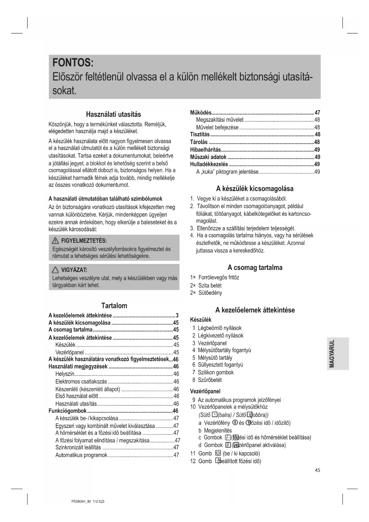 Hibaelhárítás Probléma Lehetséges ok Megoldás A készülék nem működik. A készüléknek nincs tápellátása. Ellenőrizze a hálózati aljzatot egy másik készü- lékkel. Helyesen dugja be a hálózati dugót. Ellenőrizze a házi biztosítékot. A készülék nincs bekapcsolva. A vezérlő- panelen csak az gomb látható. Nyomja meg az billentyűt a készülék be- kapcsolásához. Megjelennek a vezérlőpanelek aktiválására szolgáló billentyűk ( / ). Nem kezdte el a főzési folyamatot. Nyomja meg az gombot a főzési folyamat elindításához. Az egyik vagy mindkét sütőtartály nincs megfelelően behelyezve. A biztonsági kapcsolók megakadályozzák a nem megfelelően behelyezett sütőedényekkel való működést. Helyezze be a sütőedényeket megfelelően. Hallhatóan be kell kapcsolódniuk. Az étel nem főtt meg teljesen. A mélysütőtartály túl van töltve. Csökkentse az étel mennyiségét. A kisebb meny- nyiségek egyenletesebben sülnek meg. A hőmérséklet túl alacsonyra van beállítva. Állítson be magasabb hőmérsékletet. A sütési idő túl rövidre van beállítva. Állítson be hosszabb főzési időt. Az étel egyenetlenül főtt meg. Az ételek egymáson vannak. Ez nem biztosítja a megfelelő légkeringést. Rázza fel az ételt a sütési idő felénél. Az étel nem ropogós. Olyan ételt használt, amely csak hagyo- mányos mélysütőbe való. Használjon sütőbe való ételeket, vagy kenje meg őket kevés olajjal. Füst szivárog a készü- lékből. Nagyon zsíros ételt készít. A készülék belsejében lévő zsírfröccsenések miatt füst keletkezhet. Gondoskodjon a megfelelő szellőzésről. A mélysütőtartály túl van töltve. Az étel hozzáér a fűtőelemhez. Csökkentse az étel mennyiségét. A mélysütőtartályban vagy a fűtőelemen még mindig vannak étel- / zsírmaradvá- nyok a korábbi használatból. Minden használat után tisztítsa meg a készüléket a „Tisztítás” fejezetben leírtak szerint. Műszaki adatok Modell: ................................................................... FR 3804 H Tápegység: ........................................220 – 240 V~, 50 – 60 Hz Energiafogyasztás: ............................................... 2 × 1350 W Védelmi osztály: ..................................................................... Nettó súly: ................................................................kb. 7,3 kg A műszaki és kivitelezési módosítások jogát a folyamatos termékfejlesztés miatt fenntartjuk. Ezt a készüléket az összes vonatkozó, hatályos CE-irány- elvnek megfelelően tesztelték, és a legújabb biztonsági előírásoknak megfelelően gyártották. Hulladékkezelés A „kuka” piktogram jelentése Kímélje környezetünket, az elektromos készülé- kek nem a háztartási szemétbe valók. Használja az elektromos készülékek ártalmat- lanítására kijelölt gyűjtőhelyeket, ott adja le azokat az elektromos készülékeit, amelyeket többé már nem kíván használni. Ezzel segítséget nyújt ahhoz, hogy elkerülhetők legyenek azok a hatások, amelyeket a helytelen „szemétre dobás” gyakorolhat a környezetre és az emberi egészségre. Ezzel hozzájárul az újrahasznosításhoz, a recyclinghoz és a kiöregedett elektromos és elektronikus készülékek értékesí- tésének egyéb formáihoz.FR3804H_IM 11.0 9.23