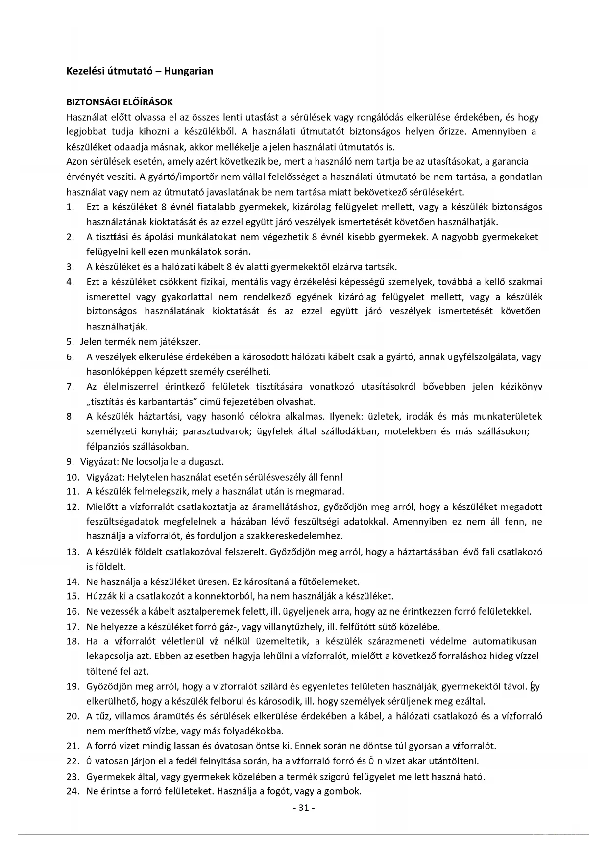 30. Mindig gondoskodjon arról, hogy a fedél zárva legyen és azt ne emeljék fel, míg a víz forr. Leforrázhatja
