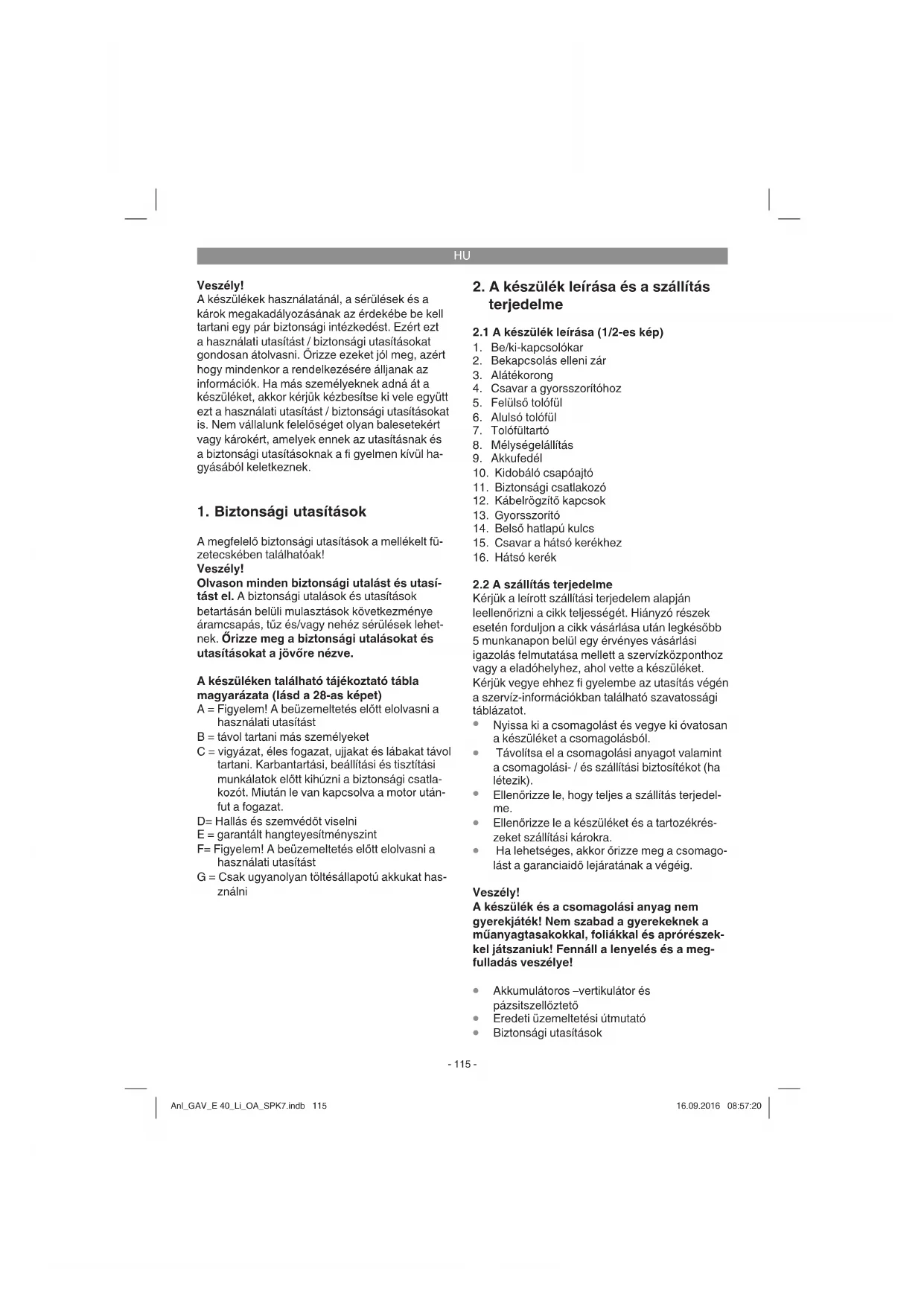 A megfelelő biztonsági utasítások a mellékelt fü- zetecskében találhatóak! Veszély! Olvason minden biztonsági utalást és utasí- tást el. A biztonsági utalások és utasítások betartásán belüli mulasztások következménye áramcsapás, tűz és/vagy nehéz sérülések lehet- nek. Őrizze meg a biztonsági utalásokat és utasításokat a jövőre nézve. A készüléken található tájékoztató tábla magyarázata (lásd a 28-as képet) A = Figyelem! A beüzemeltetés előtt elolvasni a használati utasítást B = távol tartani más személyeket C = vigyázat, éles fogazat, ujjakat és lábakat távol tartani. Karbantartási, beállítási és tisztítási munkálatok előtt kihúzni a biztonsági csatla- kozót. Miután le van kapcsolva a motor után- fut a fogazat. D= Hallás és szemvédőt viselni E = garantált hangteyesítményszint F= Figyelem! A beüzemeltetés előtt elolvasni a használati utasítást G = Csak ugyanolyan töltésállapotú akkukat has- ználni