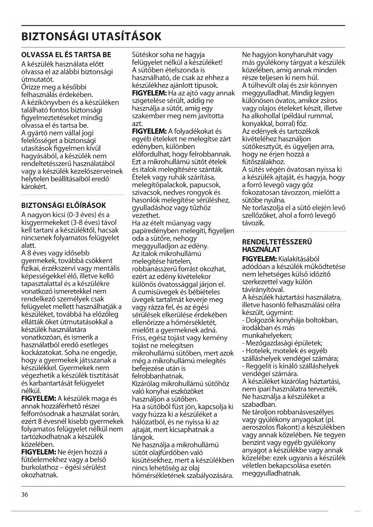 A nagyon kicsi (0-3 éves) és a kisgyermekeket (3-8 éves) távol kell tartani a készüléktől, hacsak nincsenek folyamatos felügyelet alatt. A 8 éves vagy idősebb gyermekek, továbbá csökkent fizikai, érzékszervi vagy mentális képességekkel élő, illetve kellő tapasztalattal és a készülékre vonatkozó ismeretekkel nem rendelkező személyek csak felügyelet mellett használhatják a készüléket, továbbá ha előzőleg ellátták őket útmutatásokkal a készülék használatára vonatkozóan, és ismerik a használatból eredő esetleges kockázatokat. Soha ne engedje, hogy a gyermekek játsszanak a készülékkel. Gyermekek nem végezhetik a készülék tisztítását és karbantartását felügyelet nélkül. FIGYELEM: A készülék maga és annak hozzáférhető részei felforrósodnak a használat során, ezért 8 évesnél kisebb gyermekek folyamatos felügyelet nélkül nem tartózkodhatnak a készülék közelében. FIGYELEM: Ne érjen hozzá a fűtőelemekhez vagy a belső burkolathoz – égési sérülést okozhatnak. Sütéskor soha ne hagyja felügyelet nélkül a készüléket! A sütőben ételszonda is használható, de csak az ehhez a készülékhez ajánlott típusok. FIGYELEM: Ha az ajtó vagy annak szigetelése sérült, addig ne használja a sütőt, amíg egy szakember meg nem javította azt. FIGYELEM: A folyadékokat és egyéb ételeket ne melegítse zárt edényben, különben előfordulhat, hogy felrobbannak. Ezt a mikrohullámú sütőt ételek és italok melegítésére szánták. Ételek vagy ruhák szárítása, melegítőpalackok, papucsok, szivacsok, nedves rongyok és hasonlók melegítése sérüléshez, gyulladáshoz vagy tűzhöz vezethet. Ha az ételt műanyag vagy papíredényben melegíti, figyeljen oda a sütőre, nehogy meggyulladjon az edény. Az italok mikrohullámú melegítése hirtelen, robbanásszerű forrást okozhat, ezért az edény kivételekor különös óvatossággal járjon el. A cumisüvegek és bébiételes üvegek tartalmát keverje meg vagy rázza fel, és az égési sérülések elkerülése érdekében ellenőrizze a hőmérsékletét, mielőtt a gyermeknek adná. Friss, egész tojást vagy kemény tojást ne melegítsen mikrohullámú sütőben, mert azok még a mikrohullámú melegítés befejezése után is felrobbanhatnak. Kizárólag mikrohullámú sütőhöz való konyhai eszközöket használjon a sütőben. Ha a sütőből füst jön, kapcsolja ki vagy húzza ki a készüléket a hálózatból, és ne nyissa ki az ajtaját, mert kicsaphatnak a lángok. Ne használja a mikrohullámú sütőt olajfürdőben való kisütésekhez, mert a készülékben nincs lehetőség az olaj hőmérsékletének szabályozására. Ne hagyjon konyharuhát vagy más gyúlékony tárgyat a készülék közelében, amíg annak minden része teljesen ki nem hűl. A túlhevült olaj és zsír könnyen meggyulladhat. Mindig legyen különösen óvatos, amikor zsíros vagy olajos ételeket készít, illetve ha alkohollal (például rummal, konyakkal, borral) főz. Az edények és tartozékok kivételéhez használjon sütőkesztyűt, és ügyeljen arra, hogy ne érjen hozzá a fűtőszálakhoz. A sütés végén óvatosan nyissa ki a készülék ajtaját, és hagyja, hogy a forró levegő vagy gőz fokozatosan távozzon, mielőtt a sütőbe nyúlna. Ne torlaszolja el a sütő elején levő szellőzőket, ahol a forró levegő távozik. RENDELTETÉSSZERŰ HASZNÁLAT FIGYELEM: Kialakításából adódóan a készülék működtetése nem lehetséges külső időzítő szerkezettel vagy külön távirányítóval. A készülék háztartási használatra, illetve hasonló felhasználási célra készült, úgymint: - Dolgozók konyhája boltokban, irodákban és más munkahelyeken; - Mezőgazdasági épületek; - Hotelek, motelek és egyéb szálláshelyek vendégei számára; - Reggelit is kínáló szálláshelyek vendégei számára. A készüléket kizárólag háztartási, nem ipari használatra tervezték. Ne használja a készüléket a szabadban. Ne tároljon robbanásveszélyes vagy gyúlékony anyagokat (pl. aeroszolos flakont) a készülékben vagy annak közelében. Ne tegyen benzint vagy egyéb gyúlékony anyagot a készülékbe vagy annak közelébe: ezek ugyanis a készülék véletlen bekapcsolása esetén meggyulladhatnak.37