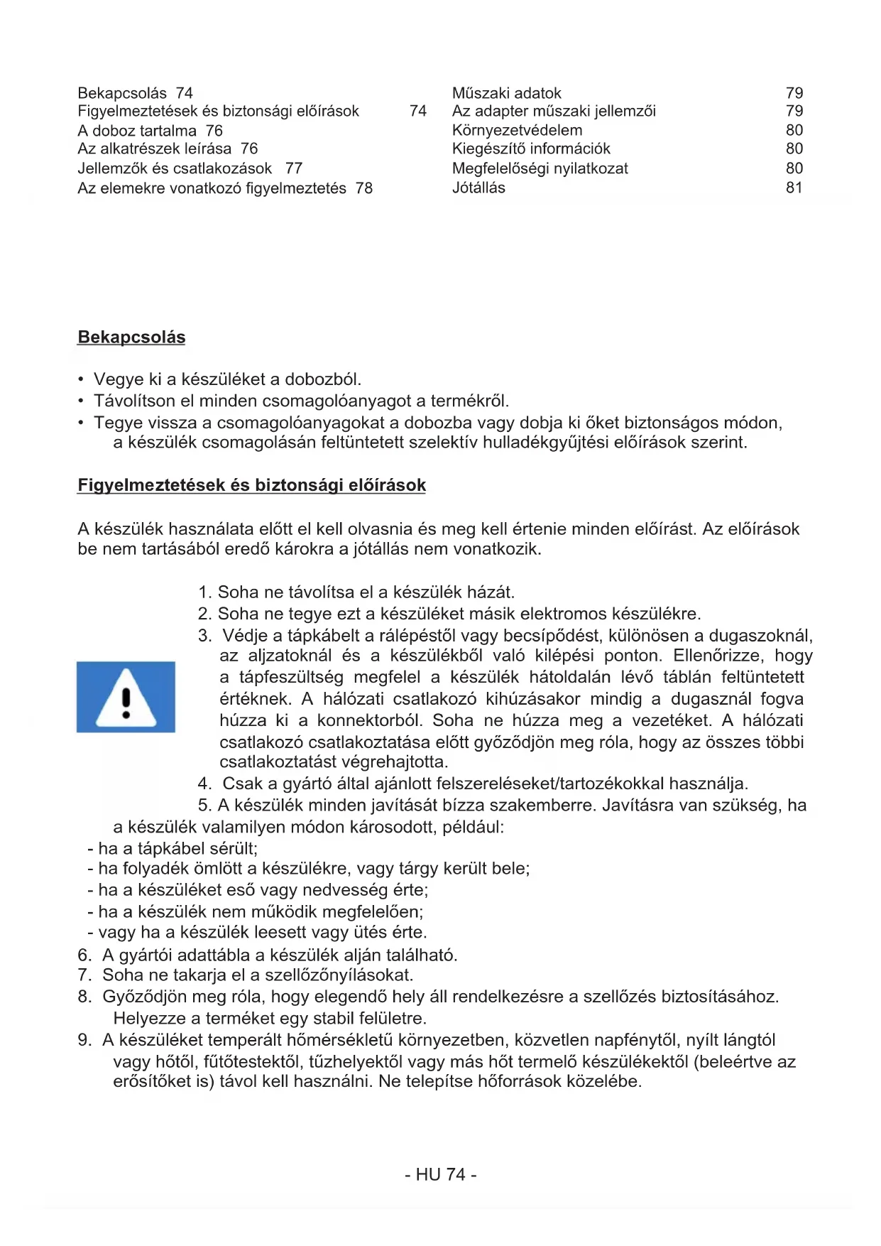 - Tegye vissza a csomagolóanyagokat a dobozba vagy dobja ki őket biztonságos módon, a készülék csomagolásán feltüntetett szelektív hulladékgyűjtési előírások szerint. Figyelmeztetések és biztonsági előírások A készülék használata előtt el kell olvasnia és meg kell értenie minden előírá. Az előírások be nem tartásából eredő károkra a jótállás nem vonatkozik.