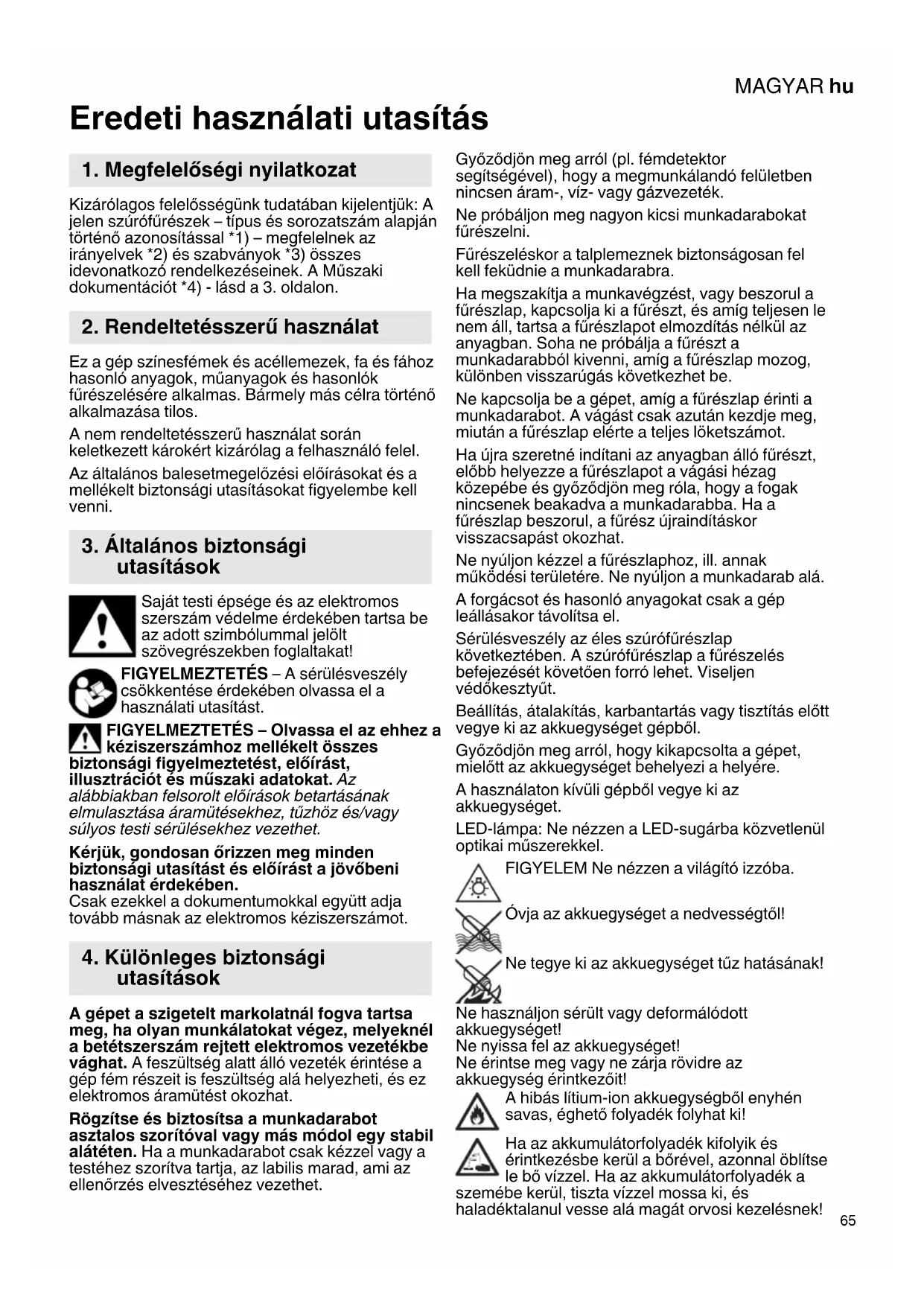 Eredeti használati utasítás Kizárólagos felelősségünk tudatában kijelentjük: A jelen szúrófűrészek – típus és sorozatszám alapján történő azonosítással *1) – megfelelnek az irányelvek *2) és szabványok *3) összes idevonatkozó rendelkezéseinek. A Műszaki dokumentációt *4) - lásd a 3. oldalon. Ez a gép színesfémek és acéllemezek, fa és fához hasonló anyagok, műanyagok és hasonlók fűrészelésére alkalmas. Bármely más célra történő alkalmazása tilos. A nem rendeltetésszerű használat során keletkezett károkért kizárólag a felhasználó felel. Az általános balesetmegelőzési előírásokat és a mellékelt biztonsági utasításokat figyelembe kell venni. Saját testi épsége és az elektromos szerszám védelme érdekében tartsa be az adott szimbólummal jelölt szövegrészekben foglaltakat! FIGYELMEZTETÉS – A sérülésveszély csökkentése érdekében olvassa el a használati utasítást. FIGYELMEZTETÉS – Olvassa el az ehhez a kéziszerszámhoz mellékelt összes biztonsági figyelmeztetést, előírást, illusztrációt és műszaki adatokat. Az alábbiakban felsorolt előírások betartásának elmulasztása áramütésekhez, tűzhöz és/vagy súlyos testi sérülésekhez vezethet. Kérjük, gondosan őrizzen meg minden biztonsági utasítást és előírást a jövőbeni használat érdekében. Csak ezekkel a dokumentumokkal együtt adja tovább másnak az elektromos kéziszerszámot. A gépet a szigetelt markolatnál fogva tartsa meg, ha olyan munkálatokat végez, melyeknél a betétszerszám rejtett elektromos vezetékbe vághat. A feszültség alatt álló vezeték érintése a gép fém részeit is feszültség alá helyezheti, és ez elektromos áramütést okozhat. Rögzítse és biztosítsa a munkadarabot asztalos szorítóval vagy más módol egy stabil alátéten. Ha a munkadarabot csak kézzel vagy a testéhez szorítva tartja, az labilis marad, ami az ellenőrzés elvesztéséhez vezethet. Győződjön meg arról (pl. fémdetektor segítségével), hogy a megmunkálandó felületben nincsen áram-, víz- vagy gázvezeték. Ne próbáljon meg nagyon kicsi munkadarabokat fűrészelni. Fűrészeléskor a talplemeznek biztonságosan fel kell feküdnie a munkadarabra. Ha megszakítja a munkavégzést, vagy beszorul a fűrészlap, kapcsolja ki a fűrészt, és amíg teljesen le nem áll, tartsa a fűrészlapot elmozdítás nélkül az anyagban. Soha ne próbálja a fűrészt a munkadarabból kivenni, amíg a fűrészlap mozog, különben visszarúgás következhet be. Ne kapcsolja be a gépet, amíg a fűrészlap érinti a munkadarabot. A vágást csak azután kezdje meg, miután a fűrészlap elérte a teljes löketszámot. Ha újra szeretné indítani az anyagban álló fűrészt, előbb helyezze a fűrészlapot a vágási hézag közepébe és győződjön meg róla, hogy a fogak nincsenek beakadva a munkadarabba. Ha a fűrészlap beszorul, a fűrész újraindításkor visszacsapást okozhat. Ne nyúljon kézzel a fűrészlaphoz, ill. annak működési területére. Ne nyúljon a munkadarab alá. A forgácsot és hasonló anyagokat csak a gép leállásakor távolítsa el. Sérülésveszély az éles szúrófűrészlap következtében. A szúrófűrészlap a fűrészelés befejezését követően forró lehet. Viseljen védőkesztyűt. Beállítás, átalakítás, karbantartás vagy tisztítás előtt vegye ki az akkuegységet gépből. Győződjön meg arról, hogy kikapcsolta a gépet, mielőtt az akkuegységet behelyezi a helyére. A használaton kívüli gépből vegye ki az akkuegységet. LED-lámpa: Ne nézzen a LED-sugárba közvetlenül optikai műszerekkel. FIGYELEM Ne nézzen a világító izzóba. Óvja az akkuegységet a nedvességtől! Ne tegye ki az akkuegységet tűz hatásának! Ne használjon sérült vagy deformálódott akkuegységet! Ne nyissa fel az akkuegységet! Ne érintse meg vagy ne zárja rövidre az akkuegység érintkezőit! A hibás lítium-ion akkuegységből enyhén savas, éghető folyadék folyhat ki! Ha az akkumulátorfolyadék kifolyik és érintkezésbe kerül a bőrével, azonnal öblítse le bő vízzel. Ha az akkumulátorfolyadék a szemébe kerül, tiszta vízzel mossa ki, és haladéktalanul vesse alá magát orvosi kezelésnek!