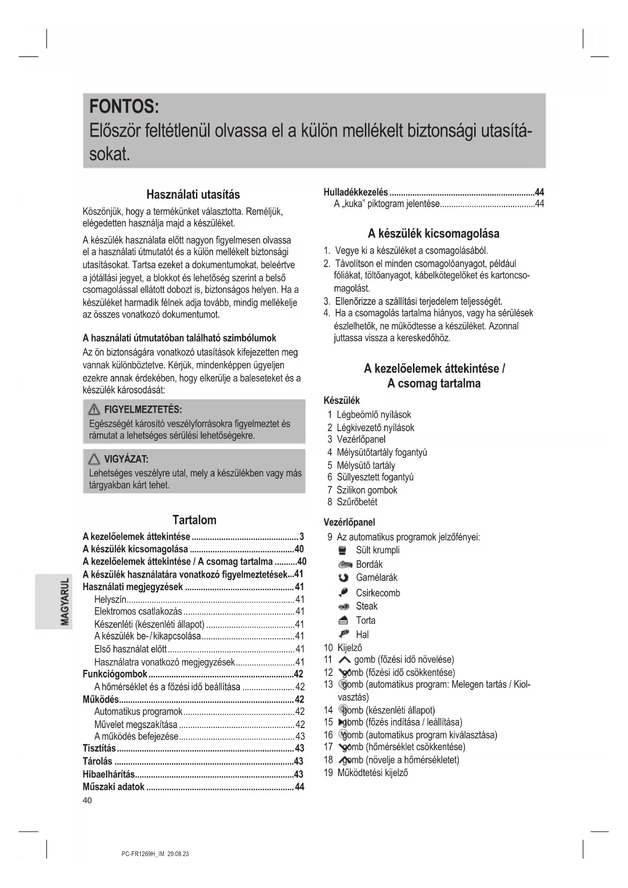 HASZNÁLATI ÚTMUTATÓ PC-FR 1269 H PROFICOOK