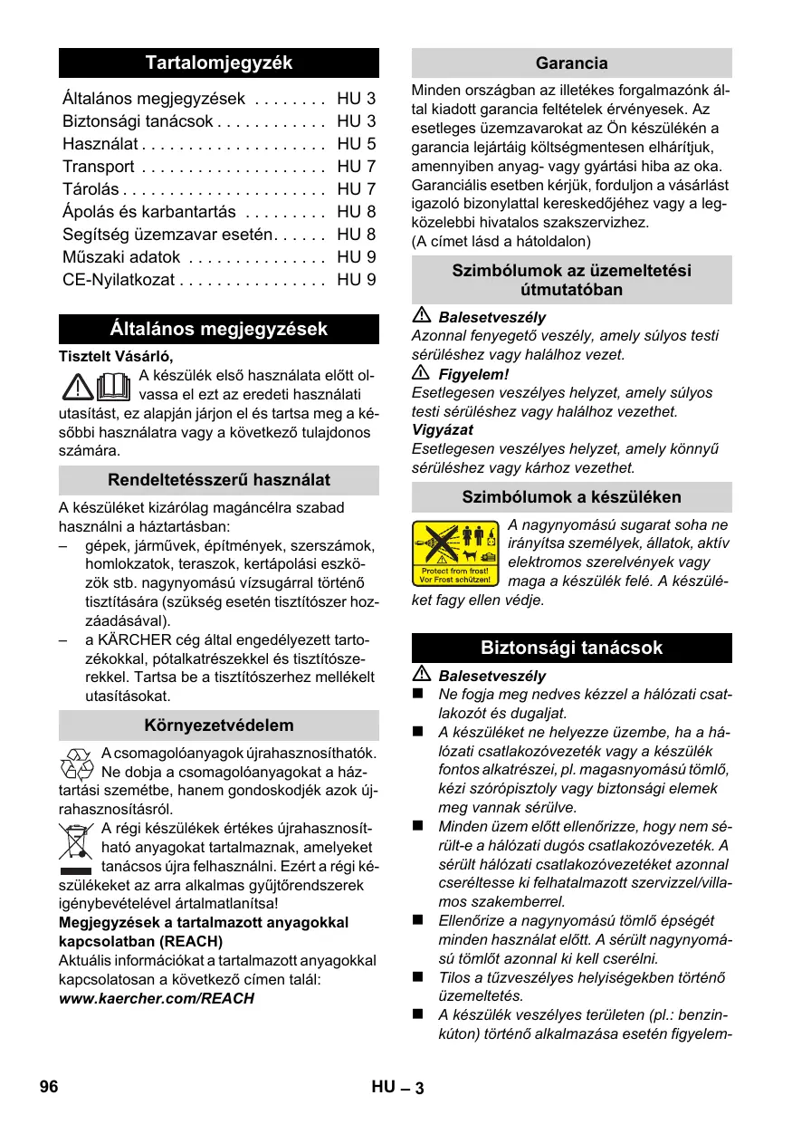Szimbólumok az üzemeltetési útmutatóban Balesetveszély Általános megjegyzések Tisztelt Vásárló, A készülék első használata előtt olvassa el ezt az eredeti használati utasítást, ez alapján járjon el és tartsa meg a későbbi használatra vagy a következő tulajdonos számára. Rendeltetésszerű használat A készüléket kizárólag magáncélra szabad használni a háztartásban: – gépek, járművek, építmények, szerszámok, homlokzatok, teraszok, kertápolási eszközök stb. nagynyomású vízsugárral történő tisztítására (szükség esetén tisztítószer hozzáadásával). – a KÄRCHER cég által engedélyezett tartozékokkal, pótalkatrészekkel és tisztítószerekkel. Tartsa be a tisztítószerhez mellékelt utasításokat. Azonnal fenyegető veszély, amely súlyos testi sérüléshez vagy halálhoz vezet. 몇 Figyelem! Esetlegesen veszélyes helyzet, amely súlyos testi sérüléshez vagy halálhoz vezethet. Vigyázat Esetlegesen veszélyes helyzet, amely könnyű sérüléshez vagy kárhoz vezethet. Szimbólumok a készüléken A nagynyomású sugarat soha ne irányítsa személyek, állatok, aktív elektromos szerelvények vagy maga a készülék felé. A készüléket fagy ellen védje. Biztonsági tanácsok Balesetveszély Ne fogja meg nedves kézzel a hálózati csatlakozót és dugaljat. Környezetvédelem A készüléket ne helyezze üzembe, ha a há- A csomagolóanyagok újrahasznosíthatók. Ne dobja a csomagolóanyagokat a háztartási szemétbe, hanem gondoskodjék azok újrahasznosításról. A régi készülékek értékes újrahasznosítható anyagokat tartalmaznak, amelyeket tanácsos újra felhasználni. Ezért a régi készülékeket az arra alkalmas gyűjtőrendszerek igénybevételével ártalmatlanítsa! Megjegyzések a tartalmazott anyagokkal kapcsolatban (REACH) Aktuális információkat a tartalmazott anyagokkal kapcsolatosan a következő címen talál: www.kaercher.com/REACH