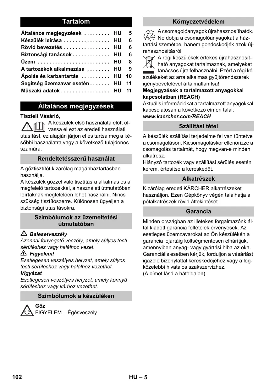Tartalom Általános megjegyzések . . . . . . . . . Magyar Készülék leírása . . . . . . . . . . . . . . . . Rövid bevezetés . . . . . . . . . . . . . . . . Biztonsági tanácsok . . . . . . . . . . . . . Üzem . . . . . . . . . . . . . . . . . . . . . . . . . A tartozékok alkalmazása . . . . . . . . Ápolás és karbantartás . . . . . . . . . . Segítség üzemzavar esetén . . . . . . . Műszaki adatok . . . . . . . . . . . . . . . . . Környezetvédelem HU 5 HU 6 HU 6 HU 6 HU 8 HU 9 HU 10 HU 11 HU 11 Általános megjegyzések Tisztelt Vásárló, A készülék első használata előtt olvassa el ezt az eredeti használati utasítást, ez alapján járjon el és tartsa meg a későbbi használatra vagy a következő tulajdonos számára. Rendeltetésszerű használat A gőztisztítót kizárólag magánháztartásban használja. A készülék gőzzel való tisztításra alkalmas és a megfelelő tartozékkal, a használati útmutatóban leírtaknak megfelelően lehet használni. Nincs szükség tisztítószerre. Különösen ügyeljen a biztonsági utasításokra. Szimbólumok az üzemeltetési útmutatóban Balesetveszély Azonnal fenyegető veszély, amely súlyos testi sérüléshez vagy halálhoz vezet. 몇 Figyelem! Esetlegesen veszélyes helyzet, amely súlyos testi sérüléshez vagy halálhoz vezethet. Vigyázat Esetlegesen veszélyes helyzet, amely könnyű sérüléshez vagy kárhoz vezethet. A csomagolóanyagok újrahasznosíthatók. Ne dobja a csomagolóanyagokat a háztartási szemétbe, hanem gondoskodjék azok újrahasznosításról. A régi készülékek értékes újrahasznosítható anyagokat tartalmaznak, amelyeket tanácsos újra felhasználni. Ezért a régi készülékeket az arra alkalmas gyűjtőrendszerek igénybevételével ártalmatlanítsa! Megjegyzések a tartalmazott anyagokkal kapcsolatban (REACH) Aktuális információkat a tartalmazott anyagokkal kapcsolatosan a következő címen talál: www.kaercher.com/REACH Szállítási tétel A készülék szállítási terjedelme fel van tüntetve a csomagoláson. Kicsomagoláskor ellenőrizze a csomagolás tartalmát, hogy megvan-e minden alkatrész. Hiányzó tartozék vagy szállítási sérülés esetén kérem, értesítse a kereskedőt. Alkatrészek Kizárólag eredeti KÄRCHER alkatrészeket használjon. Ezen Gépkönyv végén találhatja a pótalkatrészek rövid áttekintését. Garancia Minden országban az illetékes forgalmazónk által kiadott garancia feltételek érvényesek. Az esetleges üzemzavarokat az Ön készülékén a garancia lejártáig költségmentesen elhárítjuk, amennyiben anyag- vagy gyártási hiba az oka. Garanciális esetben kérjük, forduljon a vásárlást igazoló bizonylattal kereskedőjéhez vagy a legközelebbi hivatalos szakszervizhez. (A címet lásd a hátoldalon) Szimbólumok a készüléken Gőz FIGYELEM – Égésveszély