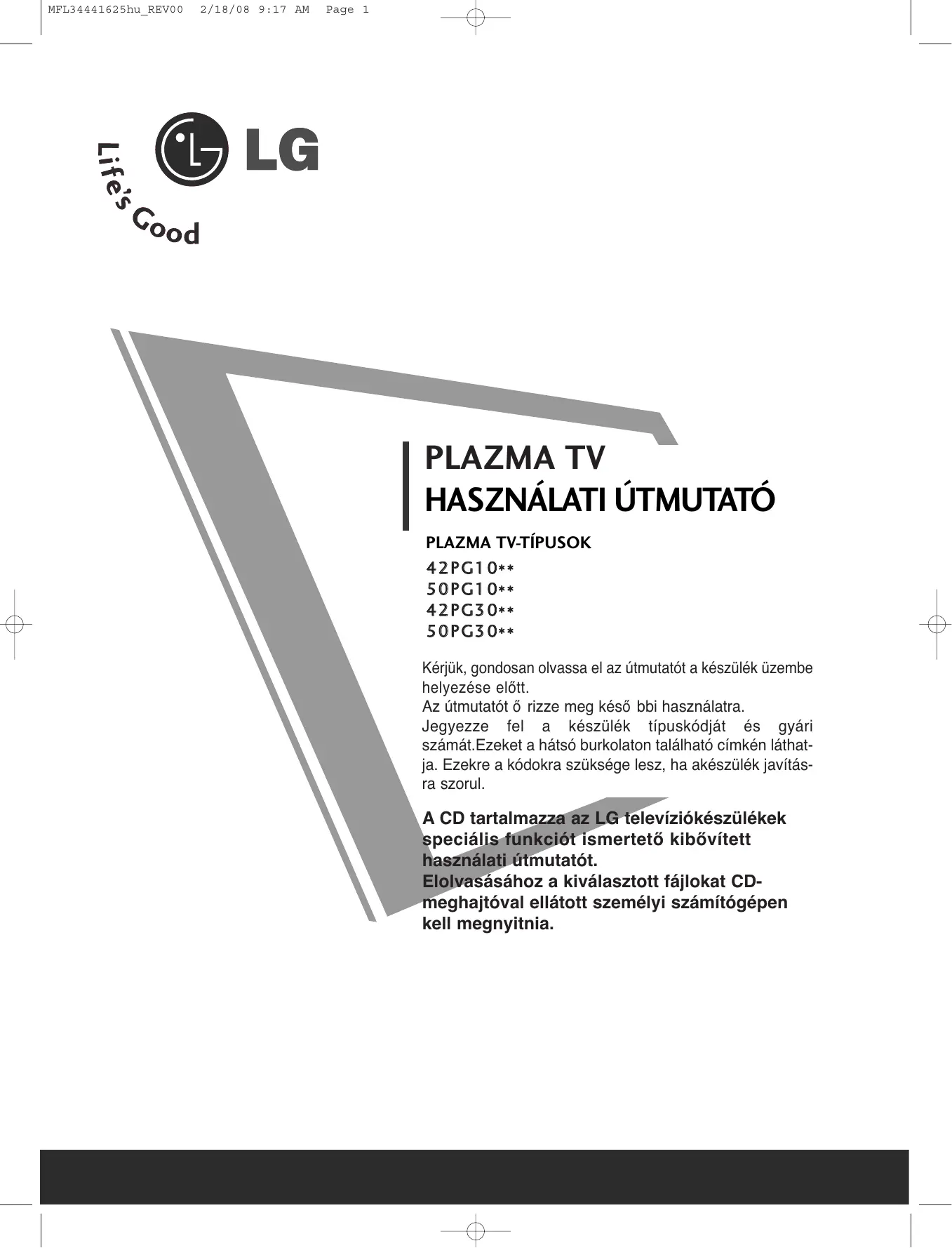 Téléchargez la notice de votre Televízió au format PDF gratuitement ! Retrouvez votre notice 42PG1000 - LG et reprennez votre appareil électronique en main. Sur cette page sont publiés tous les documents nécessaires à l'utilisation de votre appareil 42PG1000 de la marque LG.