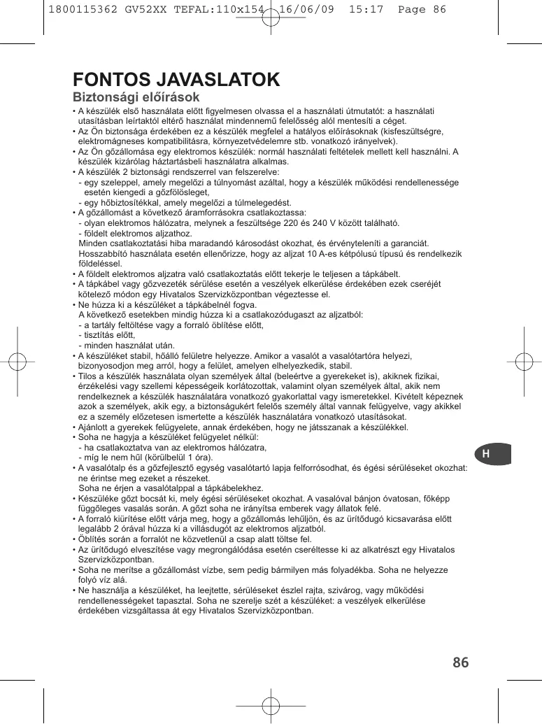 GB FONTOS JAVASLATOK D Biztonsági előírások • A készülék első használata előtt figyelmesen olvassa el a használati útmutatót: a használati utasításban leírtaktól eltérő használat mindennemű felelősség alól mentesíti a céget. • Az Ön biztonsága érdekében ez a készülék megfelel a hatályos előírásoknak (kisfeszültségre, elektromágneses kompatibilitásra, környezetvédelemre stb. vonatkozó irányelvek). • Az Ön gőzállomása egy elektromos készülék: normál használati feltételek mellett kell használni. A készülék kizárólag háztartásbeli használatra alkalmas. • A készülék 2 biztonsági rendszerrel van felszerelve: - egy szeleppel, amely megelőzi a túlnyomást azáltal, hogy a készülék működési rendellenessége esetén kiengedi a gőzfölösleget, - egy hőbiztosítékkal, amely megelőzi a túlmelegedést. • A gőzállomást a következő áramforrásokra csatlakoztassa: - olyan elektromos hálózatra, melynek a feszültsége 220 és 240 V között található. - földelt elektromos aljzathoz. Minden csatlakoztatási hiba maradandó károsodást okozhat, és érvényteleníti a garanciát. Hosszabbító használata esetén ellenőrizze, hogy az aljzat 10 A-es kétpólusú típusú és rendelkezik földeléssel. • A földelt elektromos aljzatra való csatlakoztatás előtt tekerje le teljesen a tápkábelt. • A tápkábel vagy gőzvezeték sérülése esetén a veszélyek elkerülése érdekében ezek cseréjét kötelező módon egy Hivatalos Szervizközpontban végeztesse el. • Ne húzza ki a készüléket a tápkábelnél fogva. A következő esetekben mindig húzza ki a csatlakozódugaszt az aljzatból: - a tartály feltöltése vagy a forraló öblítése előtt, - tisztítás előtt, - minden használat után. • A készüléket stabil, hőálló felületre helyezze. Amikor a vasalót a vasalótartóra helyezi, bizonyosodjon meg arról, hogy a felület, amelyen elhelyezkedik, stabil. • Tilos a készülék használata olyan személyek által (beleértve a gyerekeket is), akiknek fizikai, érzékelési vagy szellemi képességeik korlátozottak, valamint olyan személyek által, akik nem rendelkeznek a készülék használatára vonatkozó gyakorlattal vagy ismeretekkel. Kivételt képeznek azok a személyek, akik egy, a biztonságukért felelős személy által vannak felügyelve, vagy akikkel ez a személy előzetesen ismertette a készülék használatára vonatkozó utasításokat. • Ajánlott a gyerekek felügyelete, annak érdekében, hogy ne játsszanak a készülékkel. • Soha ne hagyja a készüléket felügyelet nélkül: - ha csatlakoztatva van az elektromos hálózatra, - míg le nem hűl (körülbelül 1 óra). • A vasalótalp és a gőzfejlesztő egység vasalótartó lapja felforrósodhat, és égési sérüléseket okozhat: ne érintse meg ezeket a részeket. Soha ne érjen a vasalótalppal a tápkábelekhez. • Készüléke gőzt bocsát ki, mely égési sérüléseket okozhat. A vasalóval bánjon óvatosan, főképp függőleges vasalás során. A gőzt soha ne irányítsa emberek vagy állatok felé. • A forraló kiürítése előtt várja meg, hogy a gőzállomás lehűljön, és az ürítődugó kicsavarása előtt legalább 2 órával húzza ki a villásdugót az elektromos aljzatból. • Öblítés során a forralót ne közvetlenül a csap alatt töltse fel. • Az ürítődugó elveszítése vagy megrongálódása esetén cseréltesse ki az alkatrészt egy Hivatalos Szervizközpontban. • Soha ne merítse a gőzállomást vízbe, sem pedig bármilyen más folyadékba. Soha ne helyezze folyó víz alá. • Ne használja a készüléket, ha leejtette, sérüléseket észlel rajta, szivárog, vagy működési rendellenességeket tapasztal. Soha ne szerelje szét a készüléket: a veszélyek elkerülése érdekében vizsgáltassa át egy Hivatalos Szervizközpontban.
