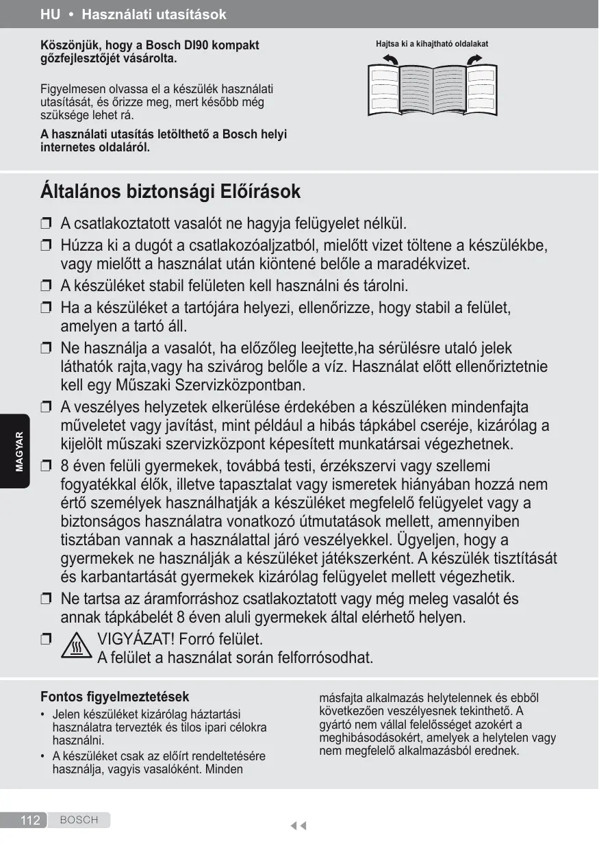 HU • Használati utasítások Köszönjük, hogy a Bosch DI90 kompakt gőzfejlesztőjét vásárolta.