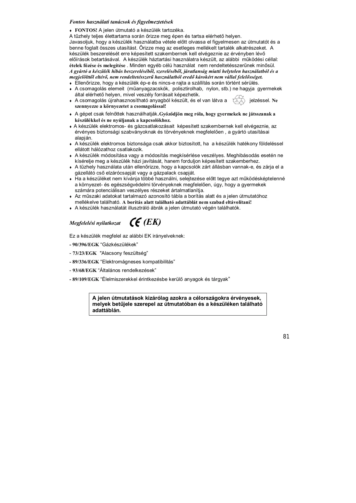 Fontos használati tanácsok és figyelmeztetések FONTOS! A jelen útmutató a készülék tartozéka. A tűzhely teljes élettartama során őrizze meg épen és tartsa elérhető helyen. Javasoljuk, hogy a készülék használatba vétele előtt olvassa el figyelmesen az útmutatót és a benne foglalt összes utasítást. Őrizze meg az esetleges mellékelt tartalék alkatrészeket. A készülék beszerelését erre képesített szakembernek kell elvégeznie az érvényben lévő előírások betartásával. A készülék háztartási használatra készült, az alábbi működési céllal: ételek főzése és melegítése . Minden egyéb célú használat nem rendeltetésszerűnek minősül. A gyártó a készülék hibás beszereléséből, szereléséből, járatlanság miatti helytelen használatból és a megjelölttől eltérő, nem rendeltetésszerű használatból eredő károkért nem vállal felelősséget. Ellenőrizze, hogy a készülék ép-e és nincs-e rajta a szállítás során történt sérülés. A csomagolás elemeit (műanyagzacskók, polisztirolhab, nylon, stb.) ne hagyja gyermekek által elérhető helyen, mivel veszély forrásait képezhetik. A csomagolás újrahasznosítható anyagból készült, és el van látva a jelzéssel. Ne szennyezze a környezetet a csomagolással! A gépet csak felnőttek használhatják.Győződjön meg róla, hogy gyermekek ne játsszanak a készülékkel és ne nyúljanak a kapcsolókhoz. A készülék elektromos- és gázcsatlakozásait képesített szakembernek kell elvégeznie, az érvényes biztonsági szabványoknak és törvényeknek megfelelően , a gyártó utasításai alapján. A készülék elektromos biztonsága csak akkor biztosított, ha a készülék hatékony földeléssel ellátott hálózathoz csatlakozik. A készülék módosítása vagy a módosítás megkísérlése veszélyes. Meghibásodás esetén ne kísérelje meg a készülék házi javítását, hanem forduljon képesített szakemberhez. A tűzhely használata után ellenőrizze, hogy a kapcsolók zárt állásban vannak-e, és zárja el a gázellátó cső elzárócsapját vagy a gázpalack csapját. Ha a készüléket nem kívánja többé használni, selejtezése előtt tegye azt működésképtelenné a környezet- és egészségvédelmi törvényeknek megfelelően, úgy, hogy a gyermekek számára potenciálisan veszélyes részeket ártalmatlanítja. Az műszaki adatokat tartalmazó azonosító tábla a borítás alatt és a jelen útmutatóhoz mellékelve található. A borítás alatt található adattáblát nem szabad eltávolítani! A készülék használatát illusztráló ábrák a jelen útmutató végén találhatók. Megfelelési nyilatkozat (EK) Ez a készülék megfelel az alábbi EK irányelveknek: - 90/396/EGK “Gázkészülékek” - 73/23/EGK "Alacsony feszültség” - 89/336/EGK “Elektromágneses kompatibilitás” - 93/68/EGK “Általános rendelkezések” - 89/109/EGK “Élelmiszerekkel érintkezésbe kerülő anyagok és tárgyak” A jelen útmutatások kizárólag azokra a célországokra érvényesek, melyek betűjele szerepel az útmutatóban és a készüléken található adattáblán.