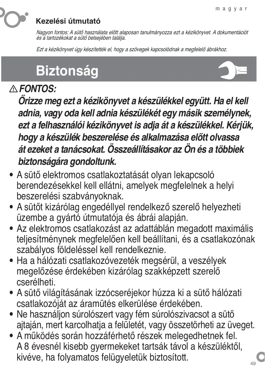 FONTOS: Őrizze meg ezt a kézikönyvet a készülékkel együtt. Ha el kell adnia, vagy oda kell adnia készülékét egy másik személynek, ezt a felhasználói kézikönyvet is adja át a készülékkel. Kérjük, hogy a készülék beszerelése és alkalmazása előtt olvassa át ezeket a tanácsokat. Összeállításakor az Ön és a többiek biztonságára gondoltunk. A sütő elektromos csatlakoztatását olyan lekapcsoló berendezésekkel kell ellátni, amelyek megfelelnek a helyi beszerelési szabványoknak. A sütőt kizárólag engedéllyel rendelkező szerelő helyezheti üzembe a gyártó útmutatója és ábrái alapján. Az elektromos csatlakozást az adattáblán megadott maximális teljesítménynek megfelelően kell beállítani, és a csatlakozónak szabályos földeléssel kell rendelkeznie. Ha a hálózati csatlakozóvezeték megsérül, a veszélyek megelőzése érdekében kizárólag szakképzett szerelő cserélheti. A sütő világításának izzócseréjekor húzza ki a sütő hálózati csatlakozóját az áramütés elkerülése érdekében. Ne használjon súrolószert vagy fém súrolószivacsot a sütő ajtaján, mert karcolhatja a felületét, vagy összetörheti az üveget. A működés során hozzáférhető részek melegedhetnek fel. A 8 évesnél kisebb gyermekeket tartsák távol a készüléktől, kivéve, ha folyamatos felügyeletük biztosított. 49
