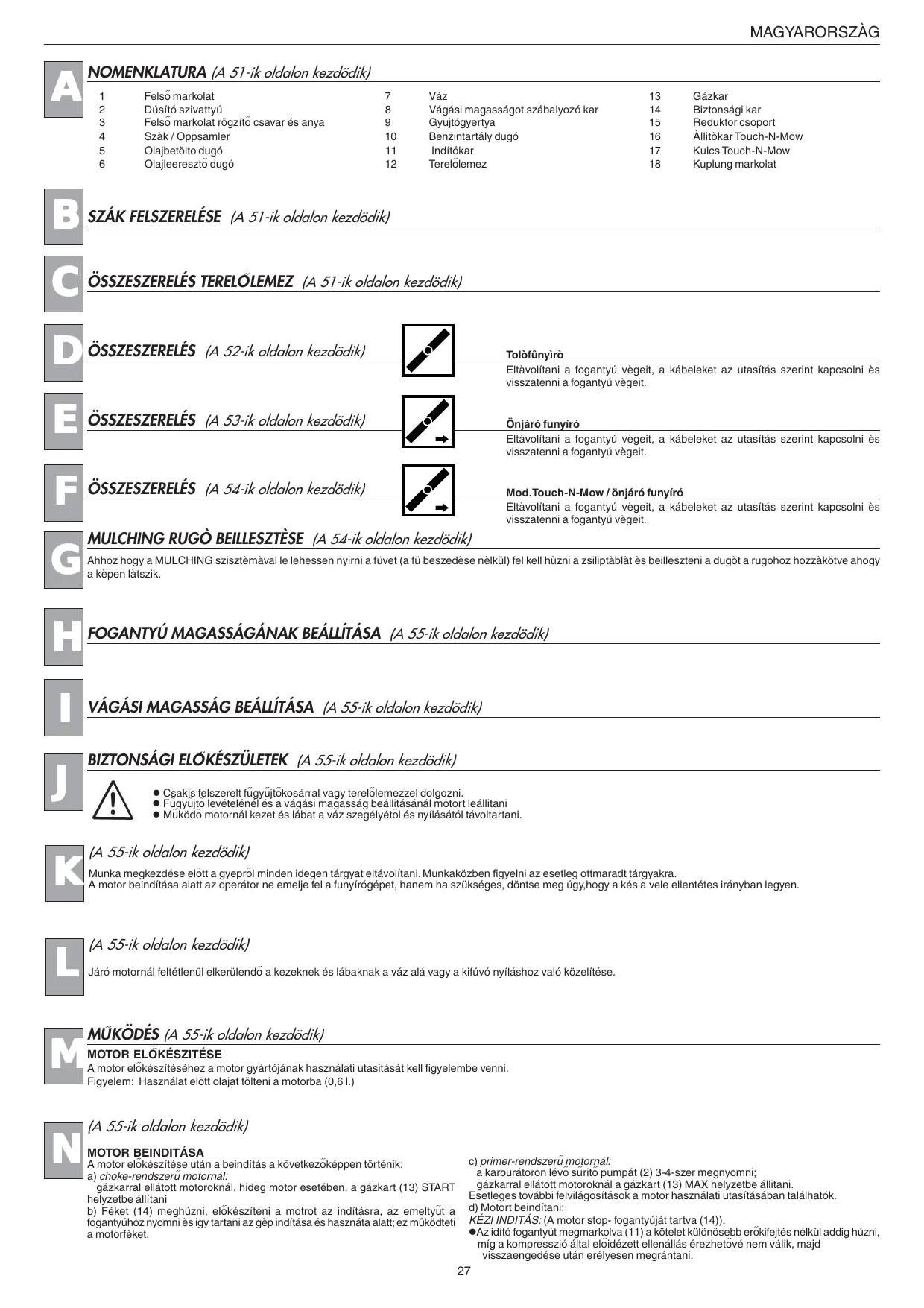 dugóját kinyitni tilos l ha a benzin kicsordult, motort nem beinditani, a gépet az érdekelt helyro^l eltávolítani és minden gyulladási leheto^ s éget elkerülni míg a benzingo^ z ök el nem párolognak. l Tartálydugót alaposan becsavarni. e)Robbanómotoros gépeket, mérgezés veszélye miatt sohasem szabad zárt helyen mu^ködtetni f)Fu^nyírás közben lèpèsbe menni, ne szaladni. g)Különös elo^vigyázatra van szükség megforduláskor, vagy mikor a gépet magunk felé húzzuk h)Emelkedo^n vagy lejto^n való dolgozás közben: l csúszásmentes cipo^t használni l vigyázni, hova lépünk l a lejto^vel keresztirányban haladni,nem hegynek vagy völgynek l menetirányt óvatosan változtatni l túl meredek lejto^n nem dolgozni i)Ne használjuk a fu^nyírógépet hibás védo^elemekkel (pl: fu^gyüjto^kosár, terelo^lemez),hanem csakis akkor, ha azok rendben felszerelve vannak. j)A fu^gyüjto^ helytelen használata veszélyes a forgó kés által szertelökött tárgyak miatt. k)Biztonsági okokból a motor fordulatszámának sohasem szabad túllépni az adattáblán jelzett értéket l) A motort óvatosan és a használati utasítás betartásával indítani. Járo motornál feltétlenül meg kell akadályozni, hogy kézzel vagy lábbal bárki is megközelitse a váz peremét vagy az üríto^nyílást m) A motor beindítása alatt az operátor ne emelje fel a fu^nyírógépet, hanem ha szükséges, döntse meg úgy, hogy a kés a vele ellenkezo^ irányba legyen fordulva. n)Ha a kés valami akadályba ütközik, motort leállítani, gyertyakupakot levenni és szakember véleményét kérni. Karbantartás és tárolás a)A biztonságos munka érdekében az összes csavart és csavaranyát gondosan meghúzott állapotban tartani. b)Ha a tartályban üzemanyag van, a gépet nem szabad olyan helyen tárolni, ahol a benzingo^zök tüzet vagy szikrát érhetnek el c)szu^k helyen való tárolás elo^tt a motornak teljesen ki kell hu^lnie d)Tu^zveszély elkerülése végett a motor, a kipufogó, az akkumulátor és a benzintartály, fu^to^l, levelekto^l és túl sok keno^anyagtól tisztán tartandó e)Gyakran elleno^rizni, hogy a fu^gyu^jto^ nincs-e elhasznált vagy megrongált állapotban f)Biztonsági okokbol az elhasználódott vagy megrongált alkatrészeket azonnal kicserélni g)A téli tárolás elo^tt a benzintartály esetleges kiürítése csakis a szabadban történhet h)A pengék fölszerelésénél követni kell a használati utasítás szabályait és csakis a Gyártó vagy Szállító nevével vagy márkájával ellenjegyzett és a vonatkozási számmal ellátott pengéket használni i)A pengék le- és felszerelésénél alkalmas védo^kesztyu^ket kell használni. j) Kiüriteni a Touch-N-Mow kèszülèket ès kivenni a biztonsàgi kulcsot mielött akàrmilyen tisztitàsi vagy karbantartàsi operàciòt vègzünk. k) Bebizonyosodni hogy a Touch-N-Mow kèszülèk le legyen merülve ès a kulcs blokk poziciòban àlljon a fünyirò szàllitàsa elött l) Ha a Touch-N-Mow beinditàsi kèszülèk meghibàsodik, ne probàljàk megjavitani, hanem kèrjèk az engedèlyezett szerelö közbelèpèst m) A biztonsàgi kulcsot kivenni annak èrdekèben hogy megelözzèk a gèp vèletlen bekapcsolòdàsàt n) Amikor a fünyiro nincs hasznàlatnan mindig kivenni a biztonsàgi kulcsot o) A kulcsot mindig egy biztonsàgi helyre eltenni hogy csak felnöttek rendelkezèsère àllhasson p) Mielött a biztonsàgi kulcsot kiveszik, megbizonyosodni hogy ez “Lock & Remove” pozicioban àlljon KARBANTARTÁS (A 56-ik oldalon kezdödik) Figyelem! Kikapcsolni a motrot ès kiiktatni a gyertyàt minden karbantartàsi muvelet elott. l4 ütemu^ robbanómotoroknál az olajszintet rendszeresen ellenorizni. Ha szükséges, olajat utánatölteni, vagy cserélni. További felvilágosítások a motor használati utasításában. lIdo^nkint elleno^rizni, hogy a csavarok és anyák kello^en meg legyenek huzva. Fu^nyírás után a gépet alul-felül alaposan megtisztitani. Megakadálvozni a váz alatti fu^lerakodást. lÜgyelni a füstkipufogó hangtompítójara....mert forró lKeréktengelyeket ido^nkint leszerelni, petróleummal megmosni és visszaszerelés elo^tt megolajozni; ugyanez érvényes a golyóscsapágyas kerekekre, de itt a csapágyakat zsírozni kell. lPengét gyakran elleno^rizni: akkor nyir jól, ha alaposan meg van fenve és ki van egyensúlyozva.