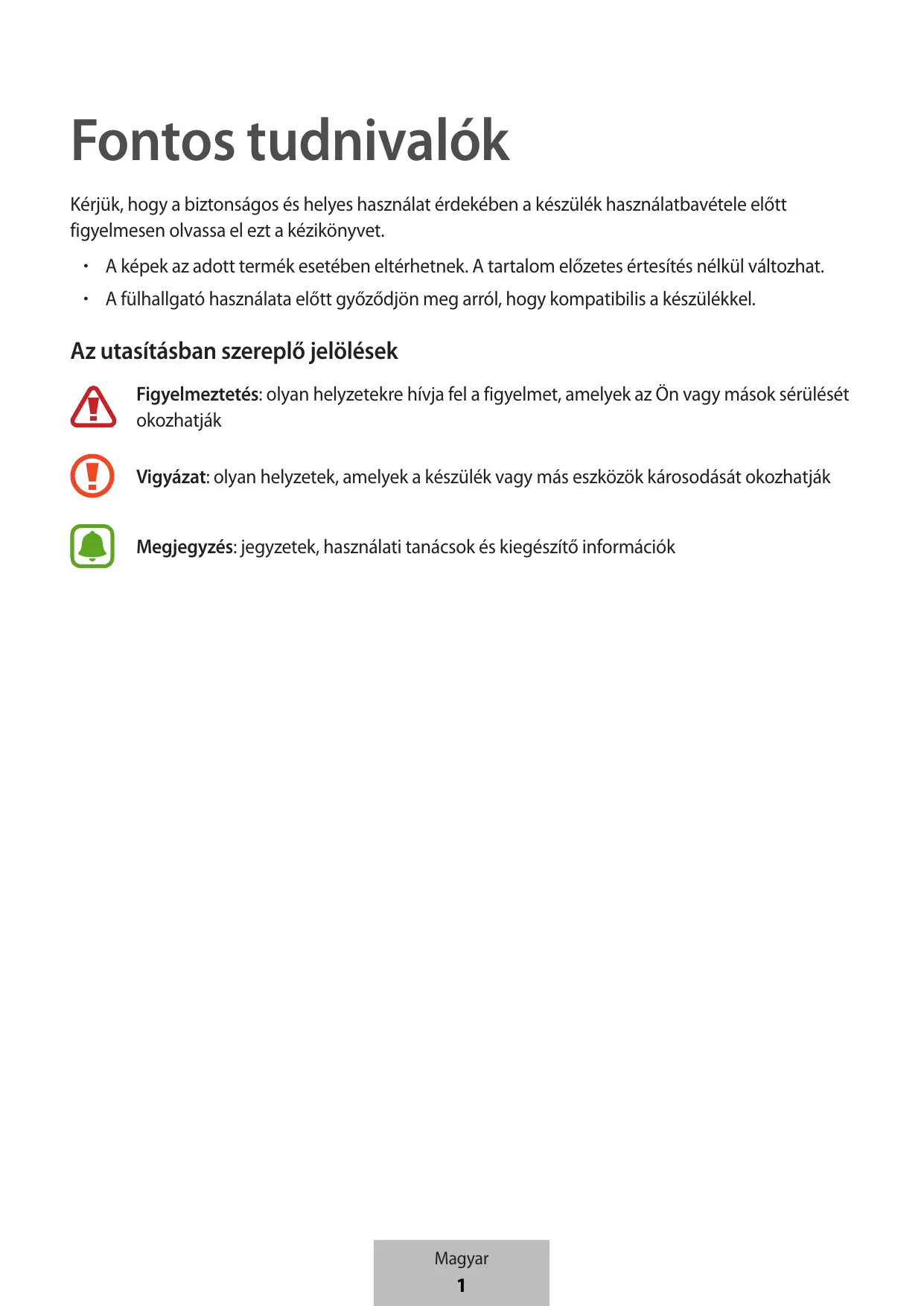 - A fülhallgató használata előtt győződjön meg arról, hogy kompatibilis a készülékkel. Az utasításban szereplő jelölések Figyelmeztetés: olyan helyzetekre hívja fel a figyelmet, amelyek az Ön vagy mások sérülését okozhatják Vigyázat: olyan helyzetek, amelyek a készülék vagy más eszközök károsodását okozhatják Megjegyzés: jegyzetek, használati tanácsok és kiegészítő információk Magyar