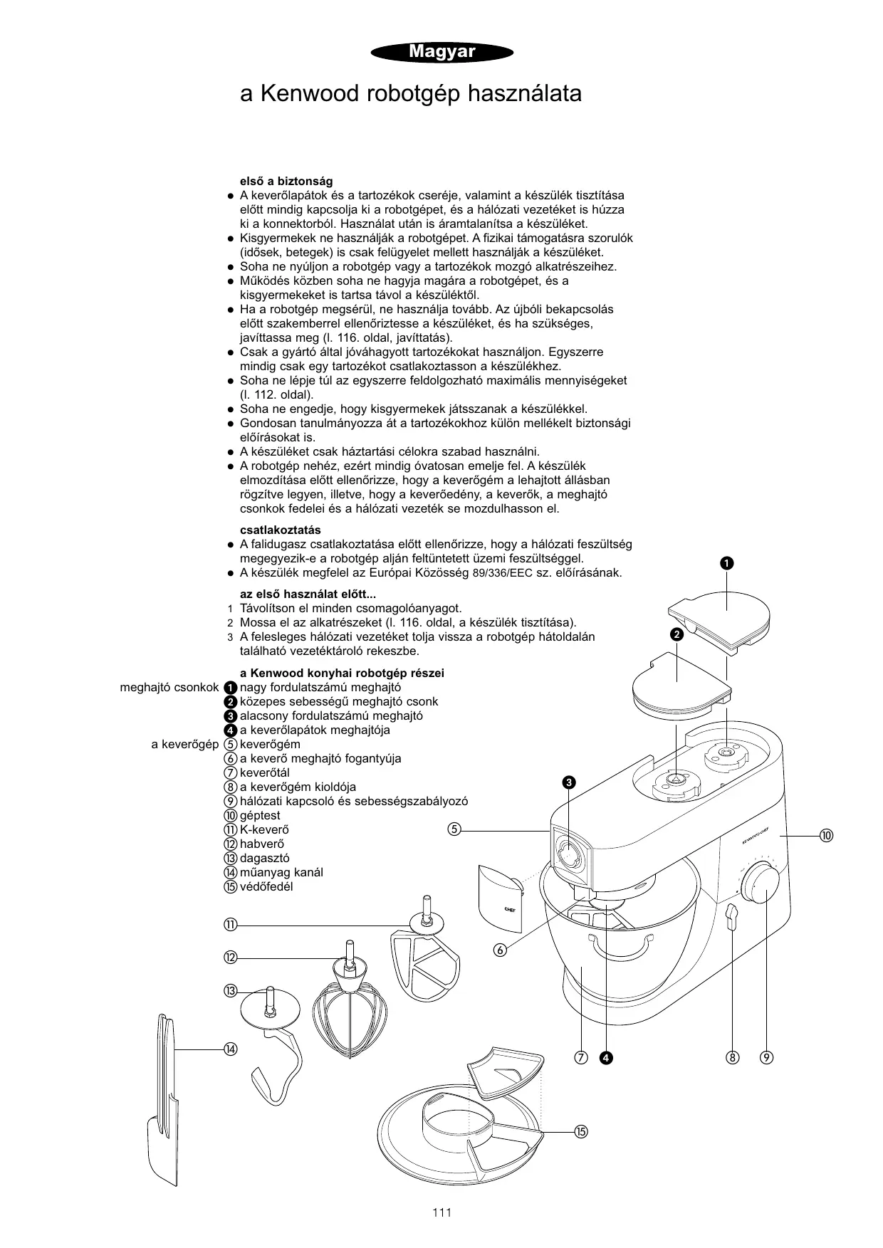 a Kenwood robotgép hasznälata elsé a biztonsäg A keverélapätok és a tartozékok cseréje, valamint a készülék tisztitésa elétt mindig kapcsolja ki a robotgépet, és a hälézati vezetéket is hüzza ki a konnektorbél. Hasznälat utén is âramtalanitsa a készüléket. Kisgyermekek ne hasznäljäk a robotgépet. À fizikai tâmogatäsra szorulék idések, betegek) is csak felügyelet mellett hasznäljäk a készüléket. Soha ne nyüljon a robotgép vagy a tartozékok mozgé alkatrészeihez. Mükôdés kôzben soha ne hagyja magära a robotgépet, és a kisgyermekeket is tartsa tâvol a készüléktôl Ha a robotgép megsérül, ne hasznälja tovébb. Az djbôli bekapcsolés elétt szakemberrel ellenériztesse a készüléket, és ha szükséges, javittassa meg (1. 116. oldal, javittatäs). Csak a gyärté éltal jévéhagyott tartozékokat hasznäljon. Egyszerre mindig csak egy tartozékot csatlakoztasson a készülékhez. Soha ne lépje tül az egyszerre feldolgozhaté maximälis mennyiségeket (L 112. oldal). Soha ne engedje, hogy kisgyermekek jâtsszanak a készülékkel. Gondosan tanulmänyozza ât a tartozékokhoz külôn mellékelt biztonsägi eléiräsokat is. Akészüléket csak häztartési célokra szabad hasznäini. A robotgép nehéz, ezért mindig évatosan emelje fel. À készülék elmozditäsa elôtt ellenérizze, hogy a keverégém a lehajtott élläsban rôgzitve legyen, illetve, hogy a kever6edény, a keverék, a meghajté csonkok fedelei és a hälézati vezeték se mozdulhasson el. csatlakoztatäs A falidugasz csatlakoztatäsa elôtt ellenérizze, hogy a hälézati feszültség megegyezik-e a robotgép aljän feltüntetett üzemi feszültséggel. Akészülék megfelel az Eurépai Kôzôsség 89/336/EEC sz. elôirésänak. az elsé hasznälat elôtt.. Tävolitson el minden csomagoléanyagot. Mossa el az alkatrészeket (I. 116. oldal, a készülék tisztitäsa). A felesleges hälézati vezetéket tolja vissza a robotgép hätoldalän talélhaté vezetéktärolé rekeszbe. CES a Kenwood konyhai robotgép részei nagy fordulatszämü meghajt kôzepes sebességü meghaité csonk alacsony fordulatszämü meghajté a keverélapätok meghajtéja keverégém @ a kever6 meghajté fogantyüja @keverétäl ® a keverëgém kioldéja © hälézati kapcsolé és sebességszabälyozé géptest DK-keveré @ habveré ® dagaszté @ müanyag kanäl ® védéfedél