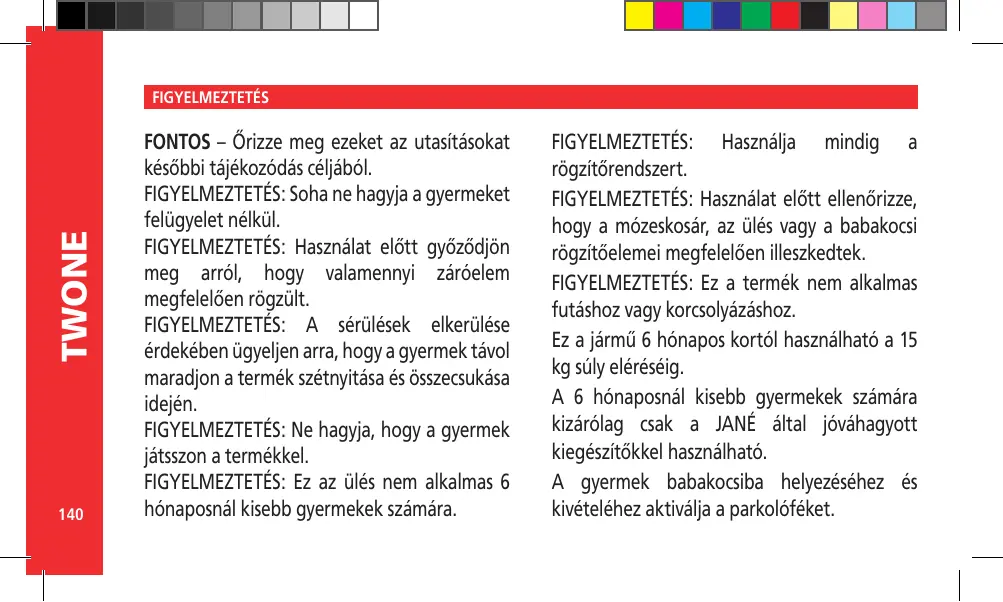 AVERTISSEMENT Ce produit ne convient pas pour faire du jogging ou des promenades en rollers. Ce véhicule est conçu pour des enfants âgés de 6 mois à 15 kg. Utilisable pour des enfants de moins de 6 mois uniquement avec des accessoires approuves par JANÉ Le dispositif de stationnement doit être activé pour installer ou retirer les enfants du véhicule. Une charge quelconque suspendue au gui-