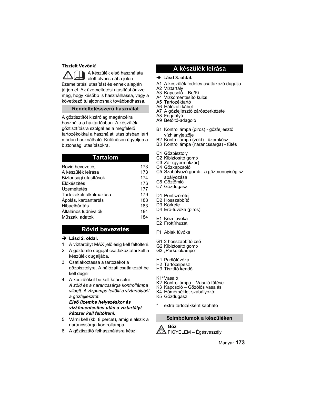 Tisztelt Vevénk! ÂA A készülék elsô hasznälata elôtt olvassa ât a jelen üzemeltetési utasitäst és ennek alapjän järjon el. Az üzemeltetési utasitäst 6rizze meg, hogy kés6bb is hasznälhassa, vagy a kôvetkezé6 tulajdonosnak tov4bbadhassa. Rendeltetésszerü hasznälat A gôztisztitôt kizärélag magäncélra hasznälja a häztartäsban. À készülék gôztisztitâsra szolgäl és a megfelelé tartozékokkal a hasznälati utasitâsban leirt médon hasznälhaté. Külônôsen ügyeljen a biztonsägi utasitäsokra. alo Rôvid bevezetés 173 A készülék leiräsa 173 Biztonsägi utasitâsok 174 Elékészités 176 Üzemeltetés 177 Tartozékok alkalmazäsa 179 Apolés, karbantartäs 183 Hibaelhäritäs 183 Âltalänos tudnivalôk 184 Müszaki adatok 184 > Läsd 2. oldal. 1 A viztartälyt MAX jelôlésig kell feltôlteni. 2 A gôztômlé dugôjät csatlakoztatni kell a készülék dugaljäba. 3 Csatlakoztassa a tartozékot a gôzpisztolyra. A hâlézati csatlakozôt be kell dugni. 4 A készüléket be kell kapcsolni. A zôld és a narancssärga kontrollämpa vilâgit. À vizpumpa feltôlti a viztartälybôl a gézfejlesztôt. Elsé üzembe helyezéskor és vizkômentesités utän a viztartälyt kétszer kell feltôlteni. 5 Värni kell (kb. 8 percet), amig elalszik a narancssärga kontrollämpa. 6 A gôztisztité felhasznäläsra kész. A készülék leiräsa > Läsd 3. oldal. A1 A készülék fedeles csatlakozé dugalja A2 Viztartäly A3 Kapcsolé — Be/Ki A4 Vizkémentesité kulcs AS Tartozéktarté A6 Hélézati käbel AT A gézfeileszté zärészerkezete A8 Fogantyü A9 Betôlté-adagolé B1 Kontrolläâmpa (piros) - gôzfeilesztô vizhiänyjelzéje B2 Kontrollämpa (züld) - üzemkész B3 Kontrollâmpa (narancssärga) - fütés C1 Gézpisztoly C2 Kibiztosité gomb C3 Zär (gyermekzär) C4 Gézkapcsolé C5 Szabälyozé gomb - a gôzmennyiség sz abä C6 G C7 Gézdugasz D1 Pontszéréfej D2 Hosszabbitô D3 Kôrkefe D4 Er6-füvéka (piros) E1 Kézi füvéka E2 Frottirhuzat F1 Ablak füvéka G1 2 hosszabbité csô G2 Kibiztosité gomb G3 ,Parkolékampé” H1 Padléfüvéka H2 Tartécsipesz H3 Tisztité kendô K1*Vasalé K2 Kontrollâmpa — Vasalé fütése K3 Kapcsolé - Gézülés vasaläs K4 Hômérséklet-szabälyozé K5 Gézdugasz extra tartozékként kaphaté Szimbélumok a készüléken Gôz FIGYELEM - Égésveszély Magyar 173