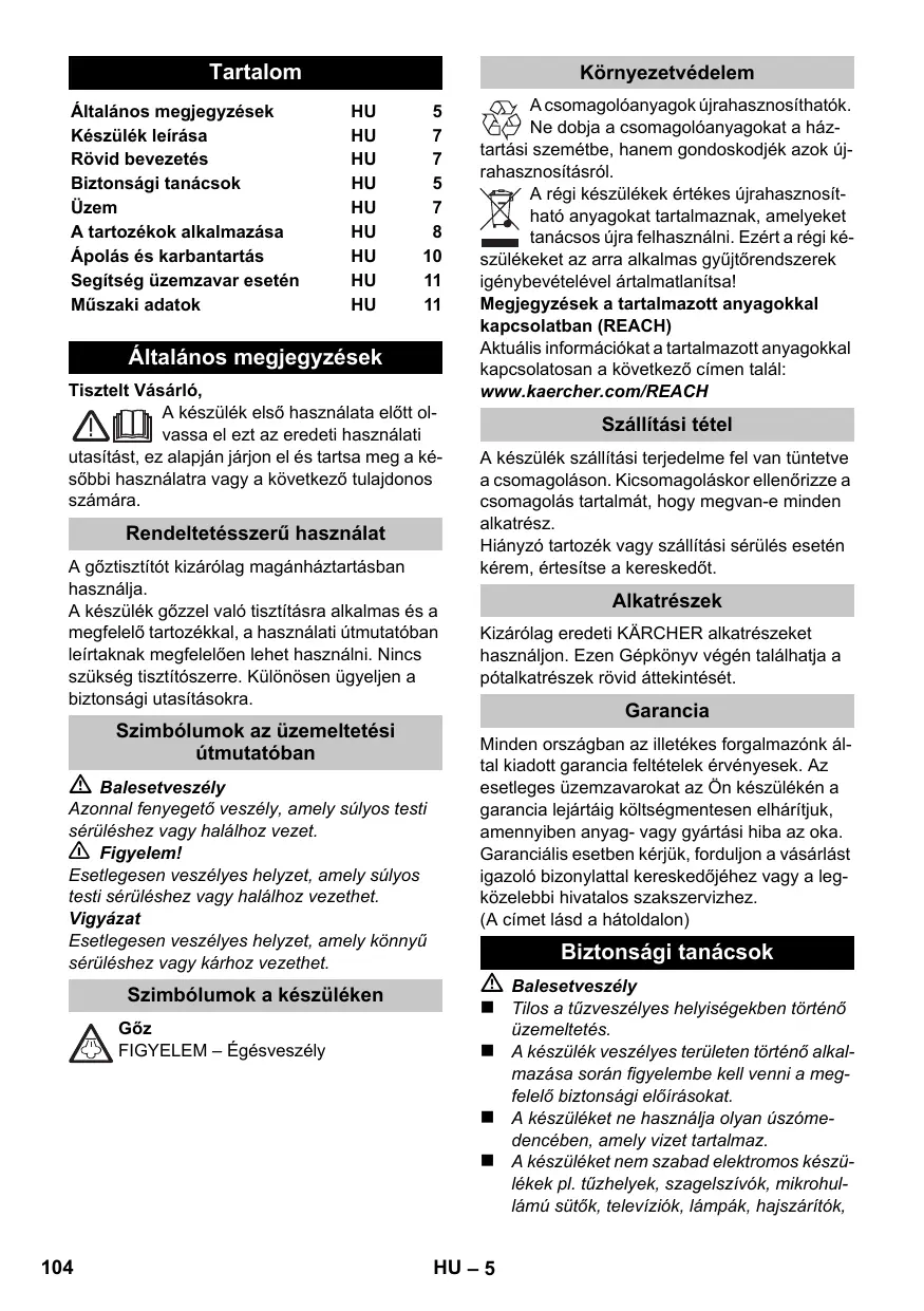 Általános megjegyzések Tisztelt Vásárló, A készülék első használata előtt olvassa el ezt az eredeti használati utasítást, ez alapján járjon el és tartsa meg a későbbi használatra vagy a következő tulajdonos számára. Rendeltetésszerű használat A gőztisztítót kizárólag magánháztartásban használja. A készülék gőzzel való tisztításra alkalmas és a megfelelő tartozékkal, a használati útmutatóban leírtaknak megfelelően lehet használni. Nincs szükség tisztítószerre. Különösen ügyeljen a biztonsági utasításokra. Szimbólumok az üzemeltetési útmutatóban Balesetveszély Azonnal fenyegető veszély, amely súlyos testi sérüléshez vagy halálhoz vezet. 몇 Figyelem! Esetlegesen veszélyes helyzet, amely súlyos testi sérüléshez vagy halálhoz vezethet. Vigyázat Esetlegesen veszélyes helyzet, amely könnyű sérüléshez vagy kárhoz vezethet. Szimbólumok a készüléken Gőz FIGYELEM – Égésveszély A csomagolóanyagok újrahasznosíthatók. Ne dobja a csomagolóanyagokat a háztartási szemétbe, hanem gondoskodjék azok újrahasznosításról. A régi készülékek értékes újrahasznosítható anyagokat tartalmaznak, amelyeket tanácsos újra felhasználni. Ezért a régi készülékeket az arra alkalmas gyűjtőrendszerek igénybevételével ártalmatlanítsa! Megjegyzések a tartalmazott anyagokkal kapcsolatban (REACH) Aktuális információkat a tartalmazott anyagokkal kapcsolatosan a következő címen talál: www.kaercher.com/REACH Szállítási tétel A készülék szállítási terjedelme fel van tüntetve a csomagoláson. Kicsomagoláskor ellenőrizze a csomagolás tartalmát, hogy megvan-e minden alkatrész. Hiányzó tartozék vagy szállítási sérülés esetén kérem, értesítse a kereskedőt. Alkatrészek Kizárólag eredeti KÄRCHER alkatrészeket használjon. Ezen Gépkönyv végén találhatja a pótalkatrészek rövid áttekintését. Garancia Minden országban az illetékes forgalmazónk által kiadott garancia feltételek érvényesek. Az esetleges üzemzavarokat az Ön készülékén a garancia lejártáig költségmentesen elhárítjuk, amennyiben anyag- vagy gyártási hiba az oka. Garanciális esetben kérjük, forduljon a vásárlást igazoló bizonylattal kereskedőjéhez vagy a legközelebbi hivatalos szakszervizhez. (A címet lásd a hátoldalon) Biztonsági tanácsok Balesetveszély Tilos a tűzveszélyes helyiségekben történő üzemeltetés. A készülék veszélyes területen történő alkalmazása során figyelembe kell venni a megfelelő biztonsági előírásokat. A készüléket ne használja olyan úszómedencében, amely vizet tartalmaz. A készüléket nem szabad elektromos készülékek pl. tűzhelyek, szagelszívók, mikrohullámú sütők, televíziók, lámpák, hajszárítók,