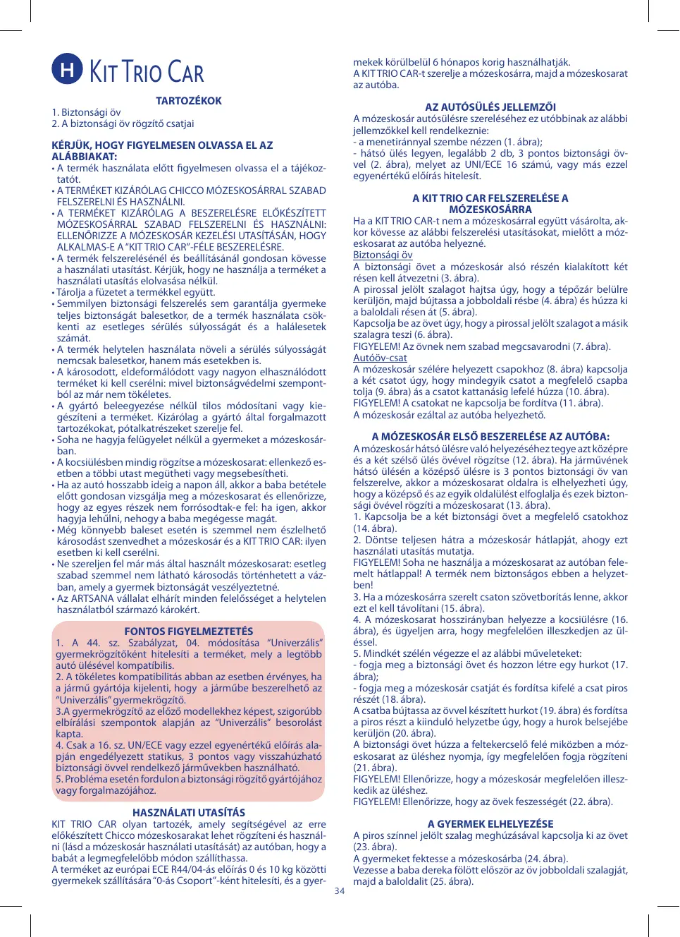 KIT TRIO CAR olyan tartozék, amely segítségével az erre előkészített Chicco mózeskosarakat lehet rögzíteni és használni (lásd a mózeskosár használati utasítását) az autóban, hogy a babát a legmegfelelőbb módon szállíthassa. A terméket az európai ECE R44/04-ás előírás 0 és 10 kg közötti gyermekek szállítására “0-ás Csoport”-ként hitelesíti, és a gyer34