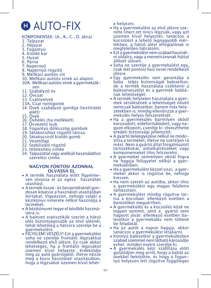 AUTO-FIX KOMPONENSEK: (A., B., C., D. ábra) 1. Talpazat 2. Héjazat 3. Fogantyú 4. Kioldó kar 5. Huzat 6. Párna 7. Napernyő 8. Napernyő rögzítő 9. Mellkasi autóöv sín 10. Mellkasi autóöv sínek az alapon 10A. Mellkasi autóöv sínek a gyermekülésen 11. Szabályzó öv 12. Övcsat 13. Csatnyelvek 13A. Csat nyitógomb 14. Övek szabályzó gombja (textilrátét alatt) 15. Övek 16. Övbélés (ha mellékelt) 17. Övvezető lyuk 18. Fogantyú dőlésszög gombok 19. Sétakocsihoz rögzítő tárcsa 20. Sétakocsiról kioldó gomb 21. Vezetőlap 22. Stabilizáló rögzítő 23. Hitelesítési cimke 24. Talpazattal vagy anélküli használathoz szerelési cimke