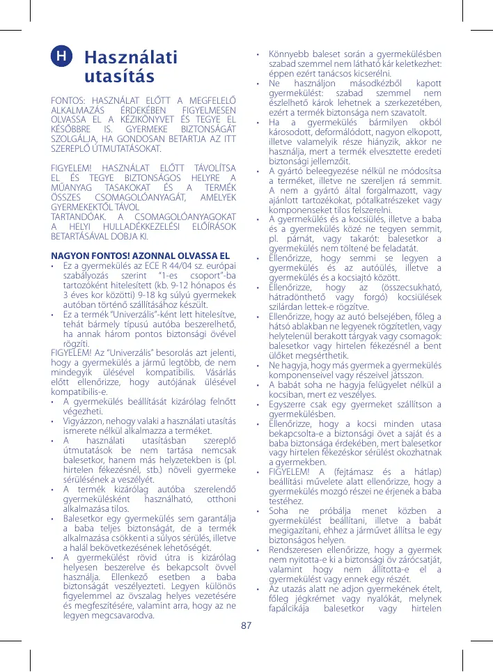 FONTOS FIGYELMEZTETÉS 1. A 44. sz. szabályzat 04. sorozat módosítása ezt a terméket “Univerzális” gyermekrögzítőként hitelesíti. Járművekben általános használatra alkalmas és ezek legtöbb, de nem mindegyik ülésével kompatibilis. 2. A tökéletes kompatibilitás ott áll fenn, ahol a járműgyártó a leírásban kijelenti, hogy a járműbe lehet szerelni “Univerzális” gyermekrögzítőt a megfelelő korosztályú gyerek számára. 3. Ez a gyermekrögzítő “Univerzális” besorolást kapott szigorúbb elbírálási szempontok alapján az előző modellekhez képest, amelyekhez nincs ilyen figyelmeztetés csatolva. 4. Csak a 16. sz. UN/ECE vagy ezzel egyenértékű előírás által engedélyezett 3 pontos, statikus vagy feltekercselős biztonsági övvel rendelkező járműben használható. 5. Kétely esetén kérje ki a termék gyártójának vagy eladójának a véleményét.