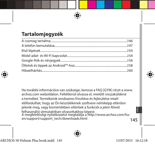 - Hibaelhárítás ARCHOS 50 Helium Plus book.indd 145 Magyar Ha további információra van szüksége, keresse a FAQ [GYIK] részt a www. archos.com weboldalon. Feltétlenül olvassa el, mielőtt visszaküldené a terméket. Termékeink rendszeres frissítése és fejlesztése miatt előfordulhat, hogy az Ön készülékének szoftvere némiképp eltérően jelenik meg, vagy kismértékben eltérőek a funkciói a jelen Rövid felhasználói útmutatóban olvasottakhoz képest. A megfelelőségi nyilatkozatot megtalálja a http://www.archos.com/huen/support/support_tech/downloads.html p. 160