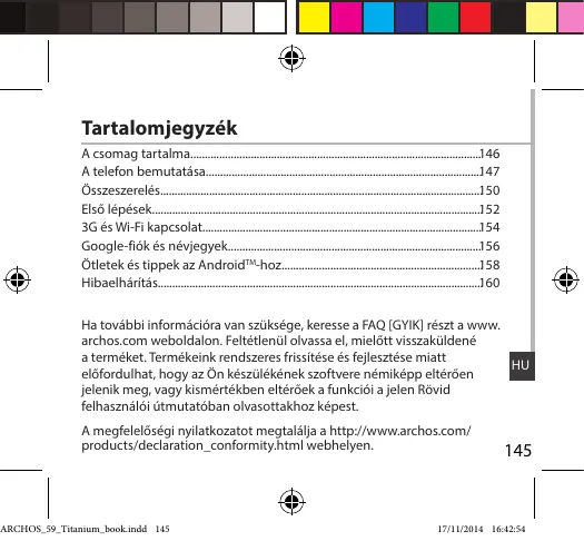 Tartalomjegyzék K Gomag rime 6 A tllon bemutatéc 147 Üsszeszerelés. 150 E6 lépések 152 36 ésW-Fkapaat 154 Google-ôk 6 néegyek 156 > Ütletek és tippek az Androïd'*-hoz. 158 Ha tovébbi informäciôra van szüksége,keresse a FAQ (GVIK részt a ww. archos.com weboldalon. Fltétlenül olvassa el, mielôt vsszaküldené à terméket. Termékeink rendszeres frisitése és fjlesztése miatt eléfordulhat, hogy az Ün készülékének szoftvere némiképp cltéréen jelenik meg, vagy kismértékben eltérôek a funkciéi a jelen Rovid felhasznälôl dtmutatéban olvasottakhoz képest. À megfeleléségi nyilatkozatot megtaläla a http}/wwwarchos.com/ products/declaration_conformityhtml webhelyen. 145