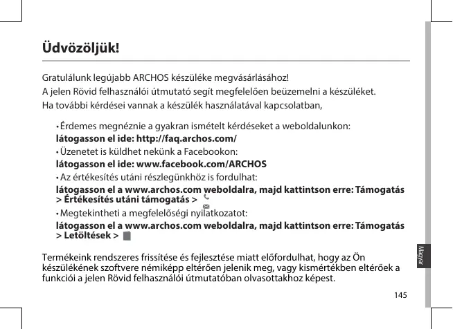 Üdvëzéljük! Gratulélunk legüjabb ARCHOS készüléke megväsärläsähoz! A jelen Rôvid felhasznäléi dtmutaté segit megfelelden beüzemelni a készüléket. Ha toväbbi kérdései vannak a készülék hasznälatäval kapcsolatban, - Érdemes megnéznie a gyakran ismételt kérdéseket a weboldalunkon: létogasson el ide: http://faq.archos.com/ -Üzenetet is küldhet nekünk a Facebookon: létogasson el ide: www.facebook.com/ARCHOS + Az értékesités utäni részlegünkhôz is fordulhat a www.archos.com weboldalra, majd kattintson erre:Témogatés s uténi tmogatäs > © + Megtekintheti a megfelelôségi nyilatkozatot: létogasson el a www.archos.com weboldalra, majd kattintson erre: Témogatés > Letôltések > Termékeink rendszeres frissitése és fejlesztése miatt elôfordulhat, hogy az Ôn készülékének szoftvere némiképp eltérôen jelenik meg, vagy kismértékben eltérôek a funkciéi a jelen Rôvid felhasznälôi dtmutatéban olvasottakhoz képest.
