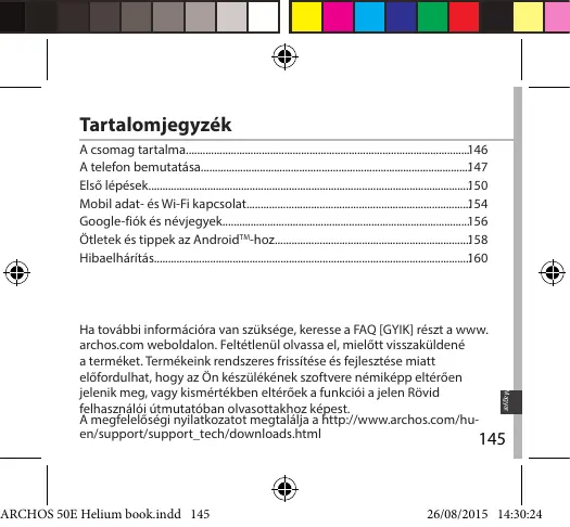 Tartalomjegyzék A csomag tartalma 146 A telefon bemutatäsa 347 Els6 lépések 150 Mobil dat és Wi-Fi kapcsolat. 154 Google-fi6k és néviegyek 156 Ofletek és tippek az Android" hoz. 158 ibaelhärités. 160 & Hi Ha tovébbi informäciôra van szüksége,keresse a FAQ (GVIK részt a ww. archos.com weboldalon. Fltétlenül olvassa el, mielôt vsszaküldené à terméket. Termékeink rendszeres frisitése és fjlesztése miatt eléfordulhat, hogy az Ün készülékének szoftvere némiképp cltéréen jelenik meg, vagy kismértékben eltérôek a funkciéi a jelen Rovid F | felhasznéléi dtmutatéban olvasottakhoz képest Rmegfelciéseg} nylatkozatot megtalala à RRpJ/Mwarchos.com/hu- en/support/support_tech/downloads.html 145