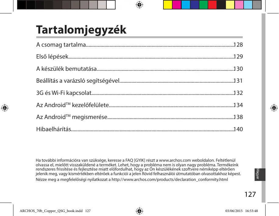 - ARCHOS_70b_Copper_QSG_book.indd 126 03/06/2015 16:53:48 Tartalomjegyzék A csomag tartalma p. 128