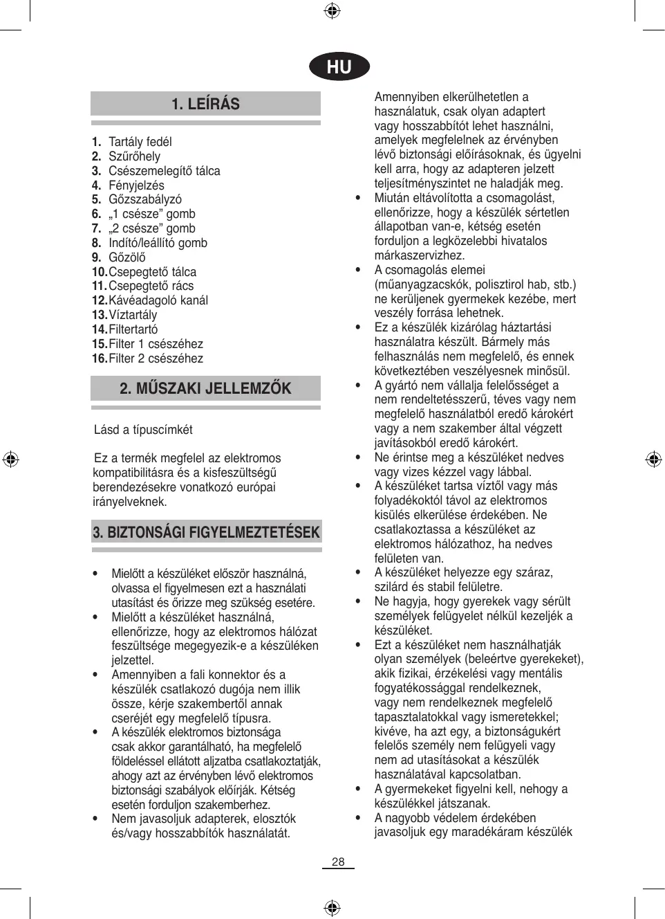 TEENDŐK Mielőtt először használná a kávéfőzőt, le kell mosni langyos tisztítószeres vízzel a filtereket (15 és 16), az adagolókanalat (12), a víztartályt (13), és a gőzölőt (9). Minden alkatrészt alaposan öblítsen le. A kávéfőző belsejét is ki kell tisztítani. Ehhez töltse fel a tartályt (13) vízzel, és működtesse kávé nélkül többször egymás után.