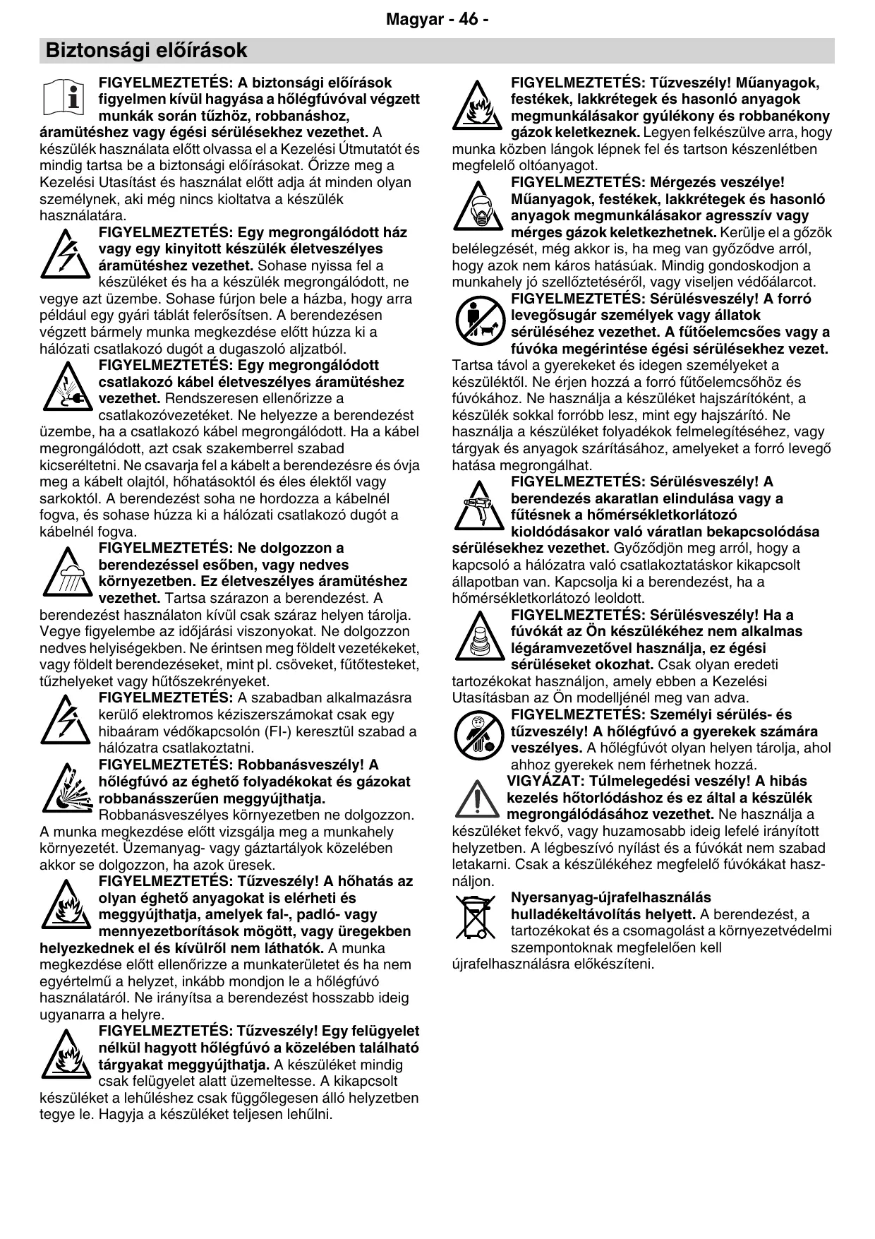 FIGYELMEZTETÉS: Tæzveszély! Mæanyagok, festékek, lakkrétegek és hasonló anyagok megmunkálásakor gyúlékony és robbanékony gázok keletkeznek. Legyen felkészülve arra, hogy munka közben lángok lépnek fel és tartson készenlétben megfelelœ oltóanyagot. FIGYELMEZTETÉS: Mérgezés veszélye! Mæanyagok, festékek, lakkrétegek és hasonló anyagok megmunkálásakor agresszív vagy mérges gázok keletkezhetnek. Kerülje el a gœzök belélegzését, még akkor is, ha meg van gyœzœdve arról, hogy azok nem káros hatásúak. Mindig gondoskodjon a munkahely jó szellœztetésérœl, vagy viseljen védœálarcot. FIGYELMEZTETÉS: Sérülésveszély! A forró levegœsugár személyek vagy állatok sérüléséhez vezethet. A fætœelemcsœes vagy a fúvóka megérintése égési sérülésekhez vezet. Tartsa távol a gyerekeket és idegen személyeket a készüléktœl. Ne érjen hozzá a forró fætœelemcsœhöz és fúvókához. Ne használja a készüléket hajszárítóként, a készülék sokkal forróbb lesz, mint egy hajszárító. Ne használja a készüléket folyadékok felmelegítéséhez, vagy tárgyak és anyagok szárításához, amelyeket a forró levegœ hatása megrongálhat. FIGYELMEZTETÉS: Sérülésveszély! A berendezés akaratlan elindulása vagy a fætésnek a hœmérsékletkorlátozó kioldódásakor való váratlan bekapcsolódása sérülésekhez vezethet. Gyœzœdjön meg arról, hogy a kapcsoló a hálózatra való csatlakoztatáskor kikapcsolt állapotban van. Kapcsolja ki a berendezést, ha a hœmérsékletkorlátozó leoldott. FIGYELMEZTETÉS: Sérülésveszély! Ha a fúvókát az Ön készülékéhez nem alkalmas légáramvezetœvel használja, ez égési sérüléseket okozhat. Csak olyan eredeti tartozékokat használjon, amely ebben a Kezelési Utasításban az Ön modelljénél meg van adva. FIGYELMEZTETÉS: Személyi sérülés- és tæzveszély! A hœlégfúvó a gyerekek számára veszélyes. A hœlégfúvót olyan helyen tárolja, ahol ahhoz gyerekek nem férhetnek hozzá. VIGYÁZAT: Túlmelegedési veszély! A hibás kezelés hœtorlódáshoz és ez által a készülék megrongálódásához vezethet. Ne használja a készüléket fekvœ, vagy huzamosabb ideig lefelé irányított helyzetben. A légbeszívó nyílást és a fúvókát nem szabad letakarni. Csak a készülékéhez megfelelœ fúvókákat használjon. Nyersanyag-újrafelhasználás hulladékeltávolítás helyett. A berendezést, a tartozékokat és a csomagolást a környezetvédelmi szempontoknak megfelelœen kell újrafelhasználásra elœkészíteni.