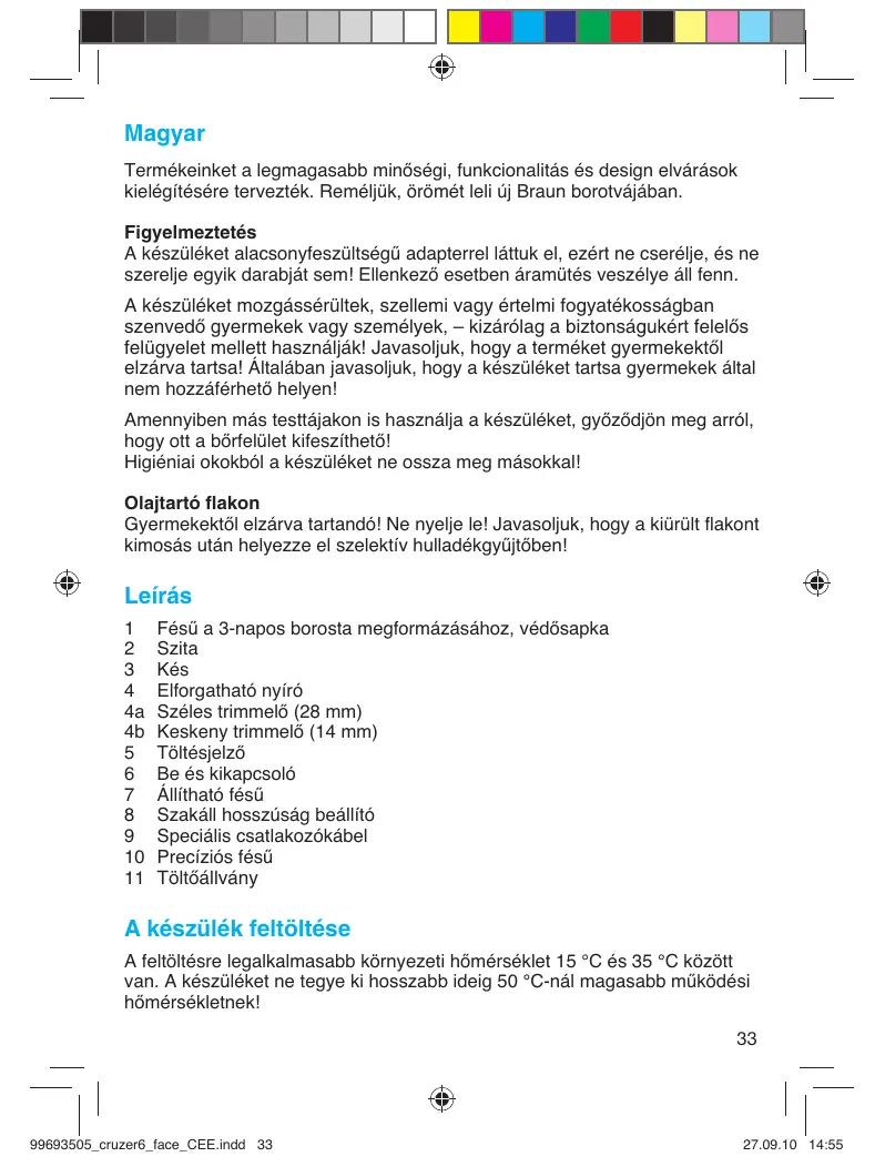 Magyar Termékeinket a legmagasabb minőségi, funkcionalitás és design elvárások kielégítésére tervezték. Reméljük, örömét leli új Braun borotvájában. Figyelmeztetés A készüléket alacsonyfeszültségű adapterrel láttuk el, ezért ne cserélje, és ne szerelje egyik darabját sem! Ellenkező esetben áramütés veszélye áll fenn. A készüléket mozgássérültek, szellemi vagy értelmi fogyatékosságban szenvedŒ gyermekek vagy személyek, – kizárólag a biztonságukért felelŒs felügyelet mellett használják! Javasoljuk, hogy a terméket gyermekektŒl elzárva tartsa! Általában javasoljuk, hogy a készüléket tartsa gyermekek által nem hozzáférhető helyen! Amennyiben más testtájakon is használja a készüléket, győződjön meg arról, hogy ott a bőrfelület kifeszíthető! Higiéniai okokból a készüléket ne ossza meg másokkal! Olajtartó flakon Gyermekektől elzárva tartandó! Ne nyelje le! Javasoljuk, hogy a kiürült flakont kimosás után helyezze el szelektív hulladékgyűjtőben! Leírás